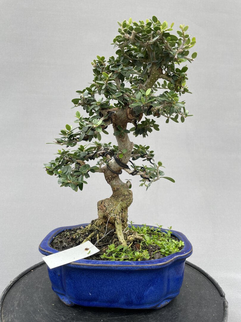 Lebhaft gewundener Olivenbaum mit einer besonders dicken Stammbasis und zahlreichen, bereits fein verzweigten Ästen, die in harmonisch gestuften "Polstern" die komplex aufgebaute Baumkrone bilden. Der auf den Abbildungen erkennbare Draht hatte im Oktober 2025 seinen Zweck erfüllt und wurde bereits entfernt, bevor er stärkere Drahtnarben hinterlassen konnte. Wilde Oliven - die genetisch unveränderte Urform des Olivenbaums haben deutlich kleinere Blätter und viel kürzere Abstände zwischen den Blattpaaren ("Internodien") als die "Kultur"-Olivenbäume und sind deshalb perfekt geeignet für die Gestaltung auch sehr fein strukturierter Baumformen. Sie lieben die volle Sonne, kommen gut mit Wind und Lufttrockenheit klar, müssen wirklich in der frostfreien Zeit draußen stehen und brauchen im Winter einen kalten (ca. 0 bis +10 Grad, nicht wärmer), frostfreien Platz mit ausreichend Licht. Rechteckige, blau glasierte Yixingschale; Gesamthöhe mit Schale 36cm