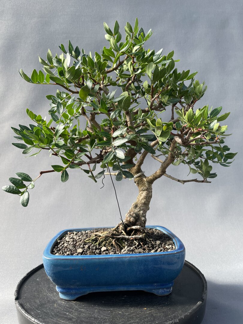 Sanft gewundener Olivenbaum mit einem kräftigen Stamm und zahlreichen, bereits fein verzweigten Ästen. Der auf den Abbildungen erkennbare Draht hatte im Oktober 2025 seinen Zweck erfüllt und wurde bereits entfernt, bevor er stärkere Drahtnarben hinterlassen konnte. Wilde Oliven - die genetisch unveränderte Urform des Olivenbaums haben deutlich kleinere Blätter und viel kürzere Abstände zwischen den Blattpaaren ("Internodien") als die "Kultur"-Olivenbäume und sind deshalb perfekt geeignet für die Gestaltung auch sehr fein strukturierter Baumformen. Sie lieben die volle Sonne, kommen gut mit Wind und Lufttrockenheit klar, müssen wirklich in der frostfreien Zeit draußen stehen und brauchen im Winter einen kalten (ca. 0 bis +10 Grad, nicht wärmer), frostfreien Platz mit ausreichend Licht. rechteckige, blau glasierte Yixingschale; Gesamthöhe mit Schale 34cm
