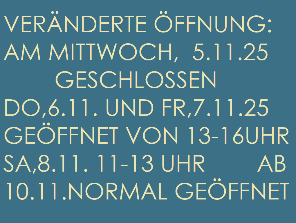 5.11.25 geschlossen, 6./7.11. 13-16Uhr 8.11.11-13Uhr geöffnet