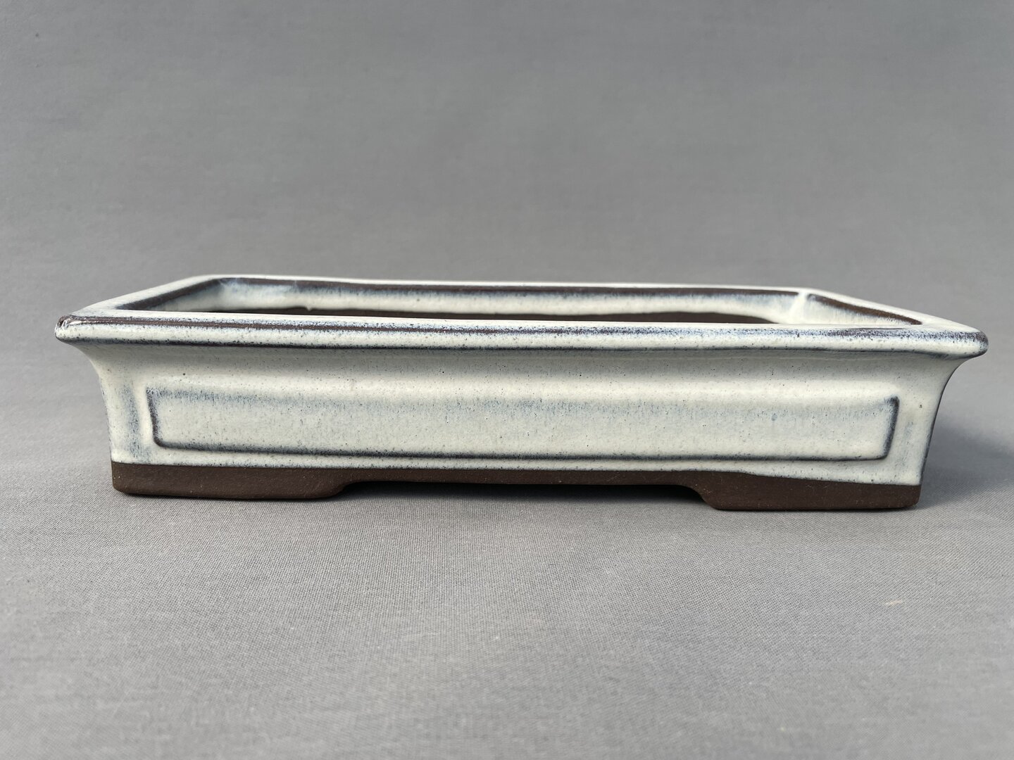 Feine, handgetöpferte, hartgebrannte, betont schlichte,; rechteckige, unglasierte Schale aus dunkelgraubraunem Ton für dickstämmige Bonsai oder als universell geeigneter Topf für Pflanzen mit hohen Wurzelballen; Außendurchmesser 27x18,5x13cm
