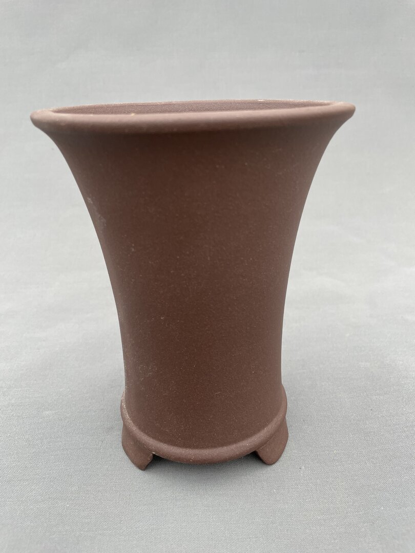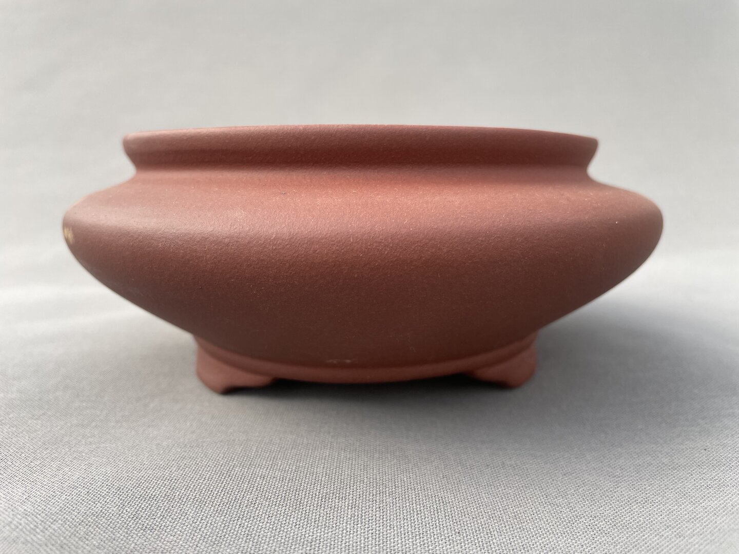 Feine und relativ leichte und dünnwandige, handgetöpferte, hartgebrannte, runde, unglasierte Kaskadenschale aus rotbraunem Ton, Außendurchmesser 8,5cm, Höhe außen 16,5cm