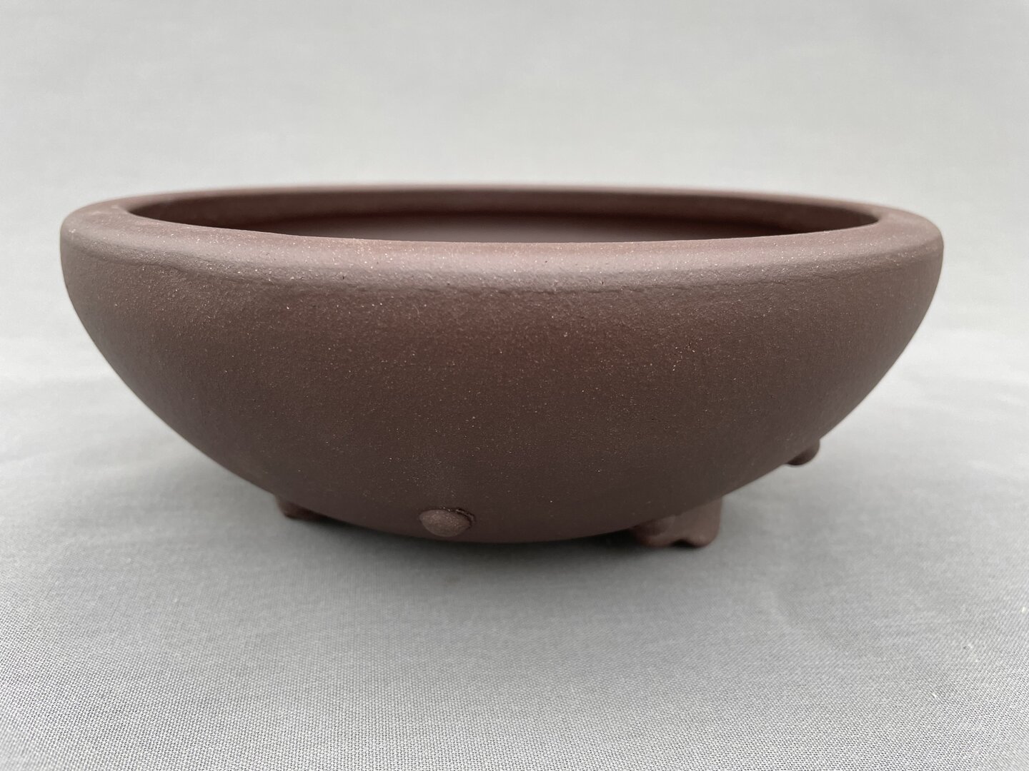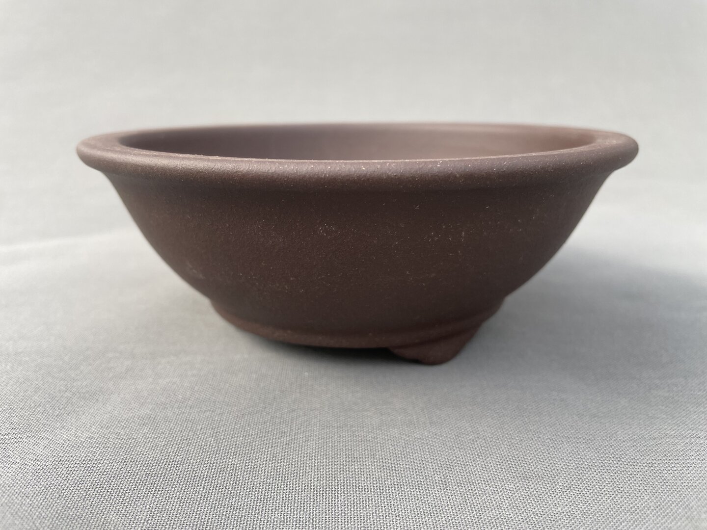 Feine und relativ leichte und dünnwandige, handgetöpferte, hartgebrannte, runde, unglasierte Schale aus braunem Ton, Außendurchmesser 15cm, Höhe außen 6cm