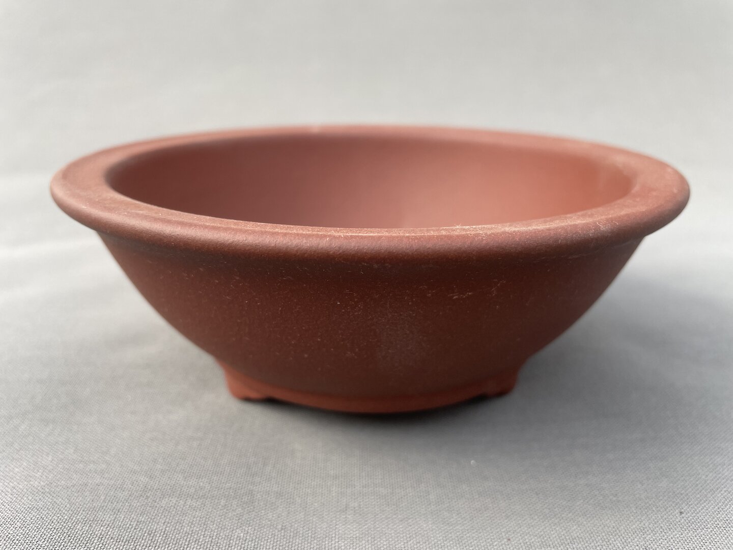 Feine und relativ leichte und dünnwandige, handgetöpferte, hartgebrannte, runde, unglasierte Schale aus rotbraunem Ton, Außendurchmesser 15,5cm, Höhe außen 6cm