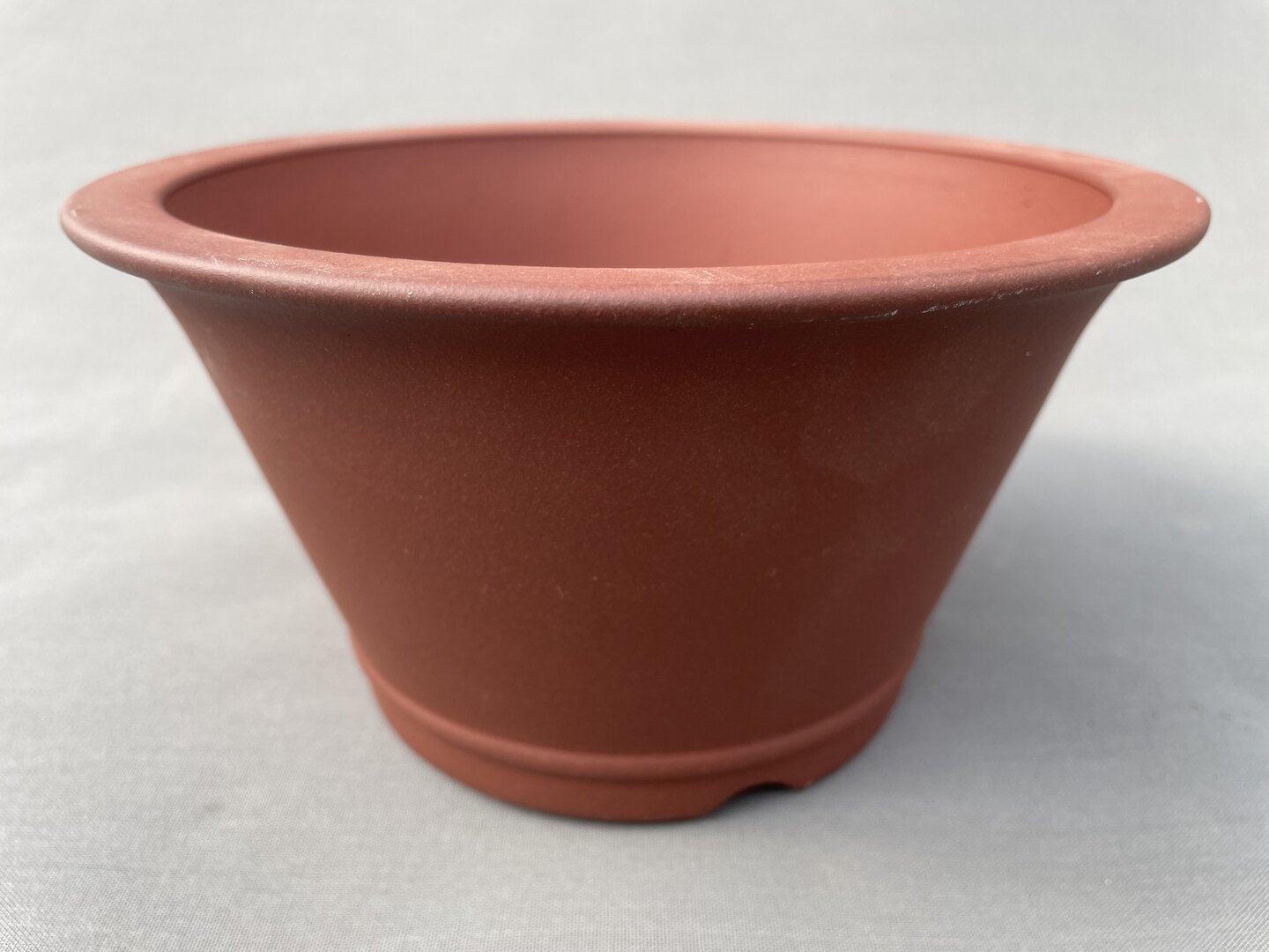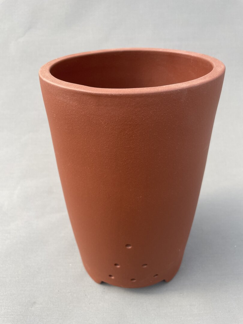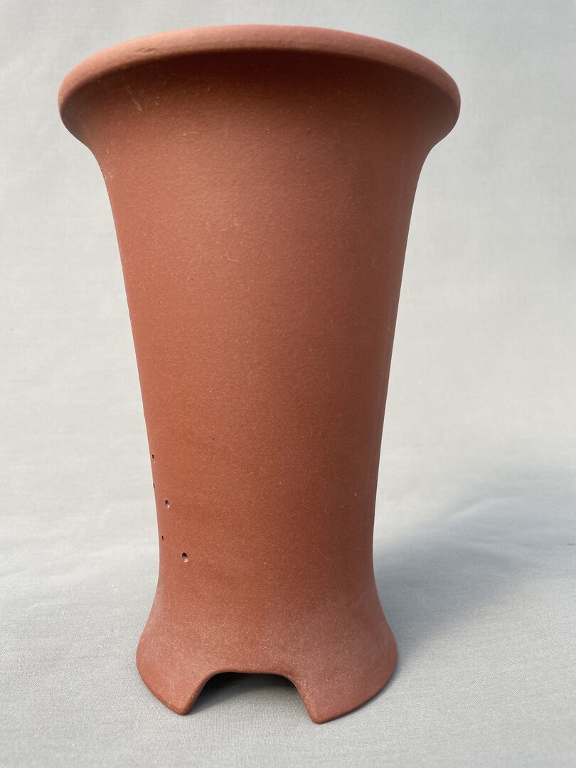 Feine und relativ leichte und dünnwandige, handgetöpferte, hartgebrannte, runde, unglasierte Kaskadenschale aus rotbraunem Ton, Außendurchmesser 10,5cm, Höhe außen 21,5cm