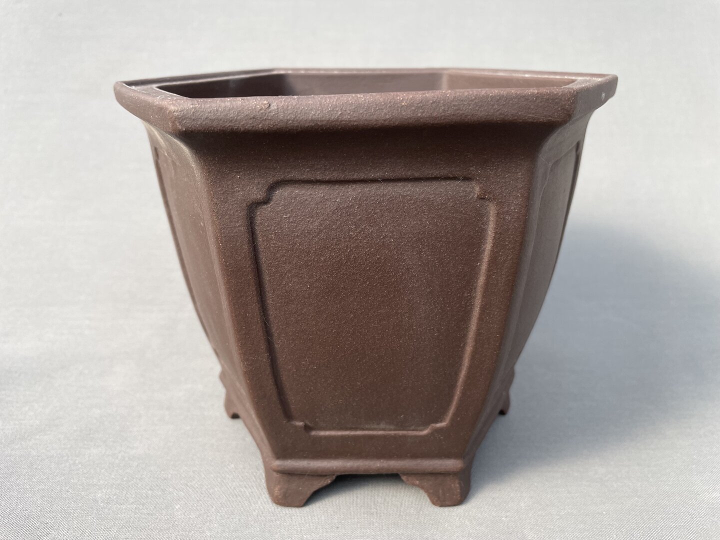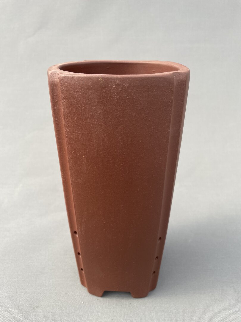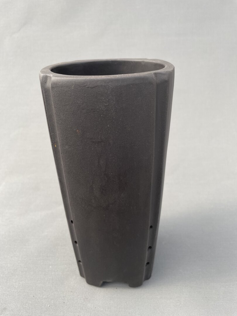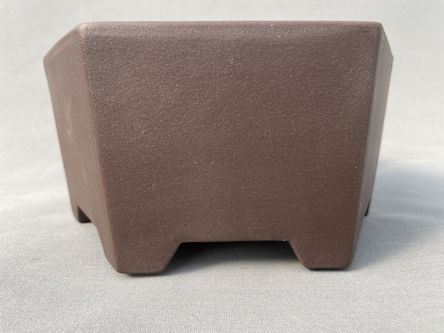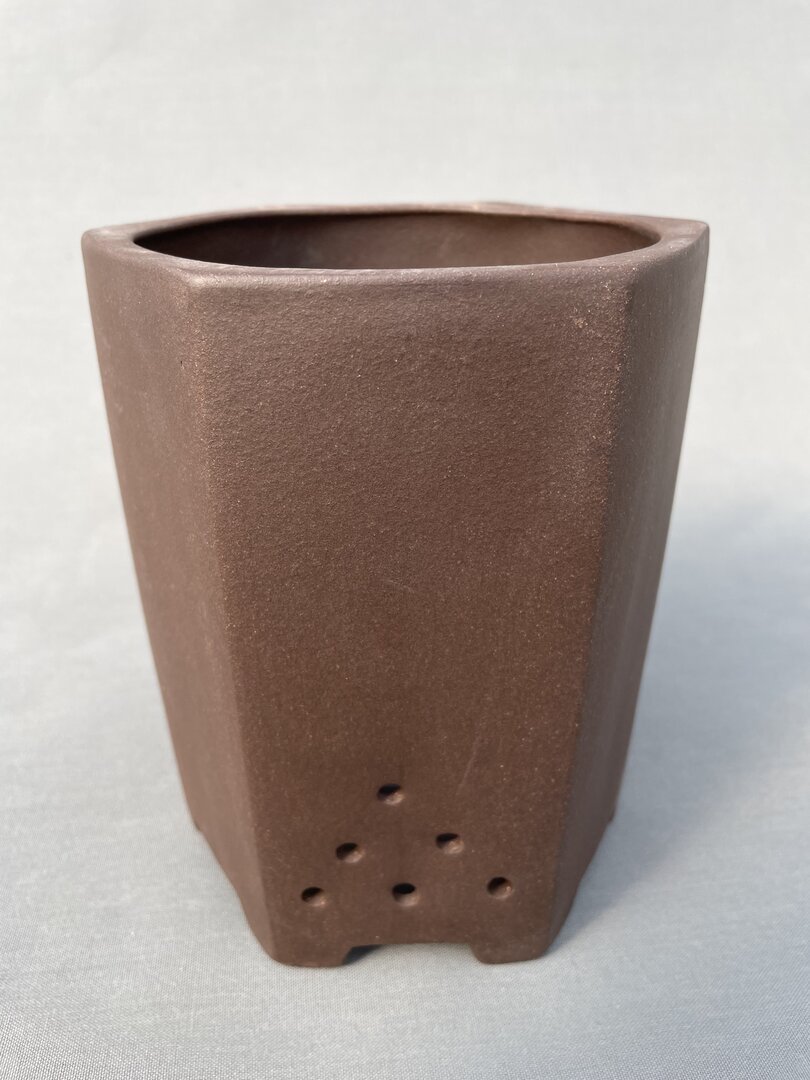 Feine und relativ leichte und dünnwandige, handgetöpferte, hartgebrannte, sechseckige, unglasierte Kaskadenschale aus dunkelbraunem Ton; ein sehr sinnvolles, besonderes Extra sind drei Gruppen von jeweils 6 kleinen, zusätzlichen Drainage- und Belüftungslöchern im unteren Seitenwandbereich; Außendurchmesser 14/13cm, Höhe außen 17,5cm