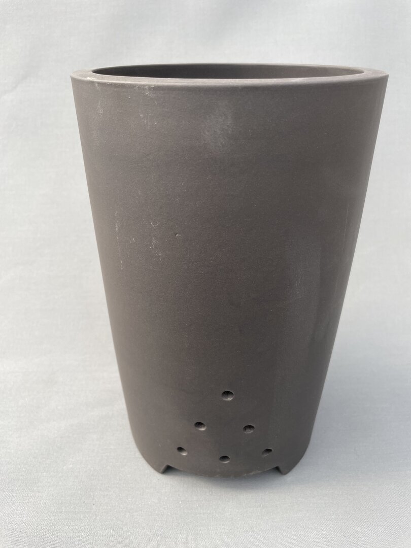 Feine und relativ leichte und dünnwandige, handgetöpferte, hartgebrannte, runde, unglasierte Kaskadenschale aus dunkelgrau-braunem Ton; besondere, sehr sinnvolles Extra dieses Models: im unteren Seitenbereich haben die Töpfe auf drei Seiten jeweils 6 kleine, zusätzliche Belüftungs-/ Drainagelöcher; Außendurchmesser 16,5cm, Höhe außen 25,5cm