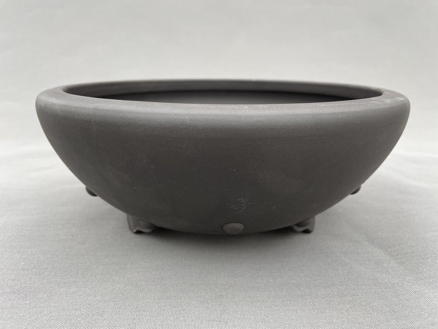 Feine und relativ leichte und dünnwandige, handgetöpferte, hartgebrannte, runde, unglasierte Schale aus dunkelgrau-braunem Ton mit einem seidenmatt glänzenden Finish; Außendurchmesser 29cm, Höhe außen 9,5cm