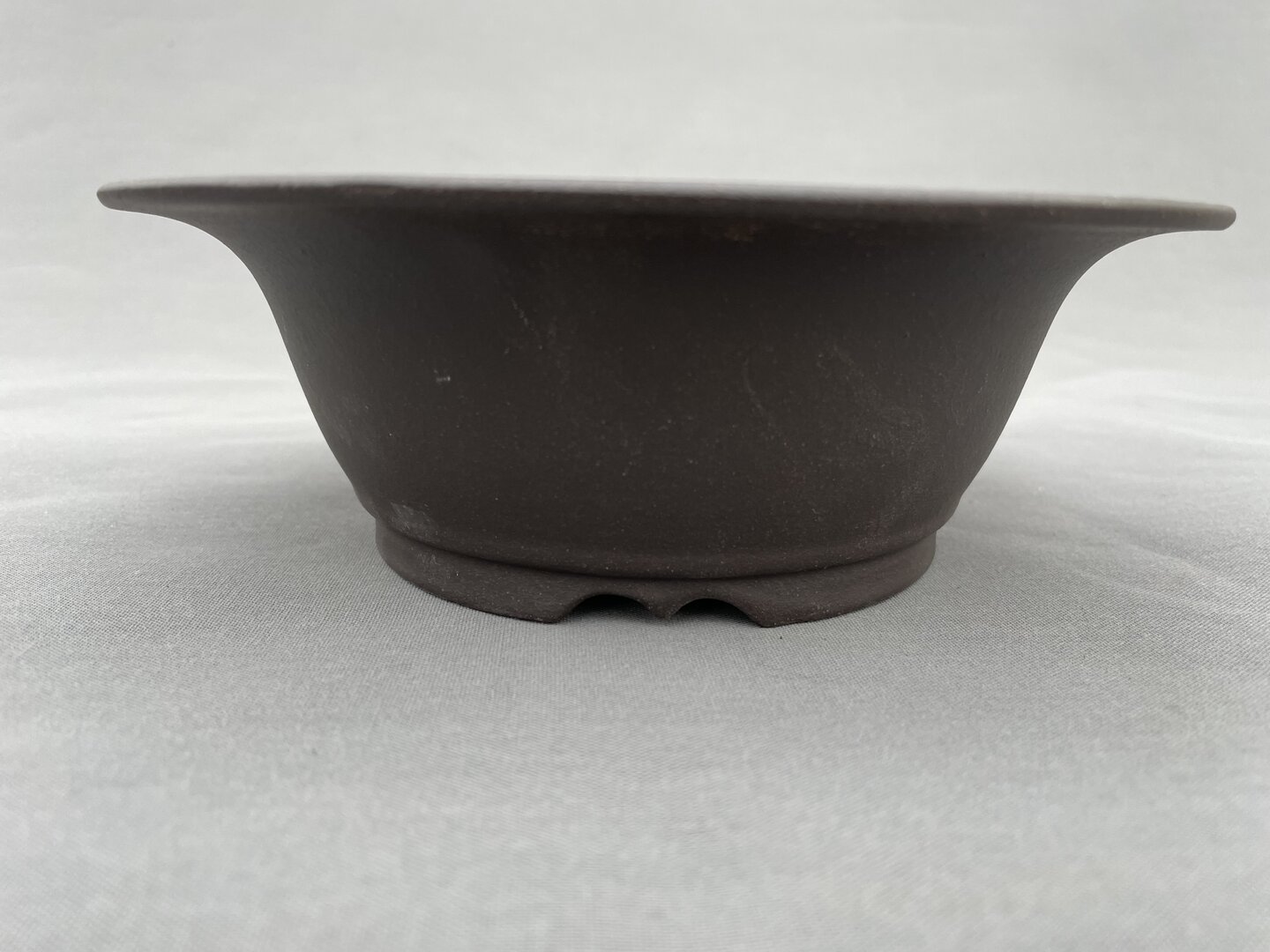 Feine und relativ leichte und dünnwandige, handgetöpferte, hartgebrannte, runde, unglasierte Schale aus dunkelbraunem Ton, Außendurchmesser 19cm, Höhe außen 10,5cm