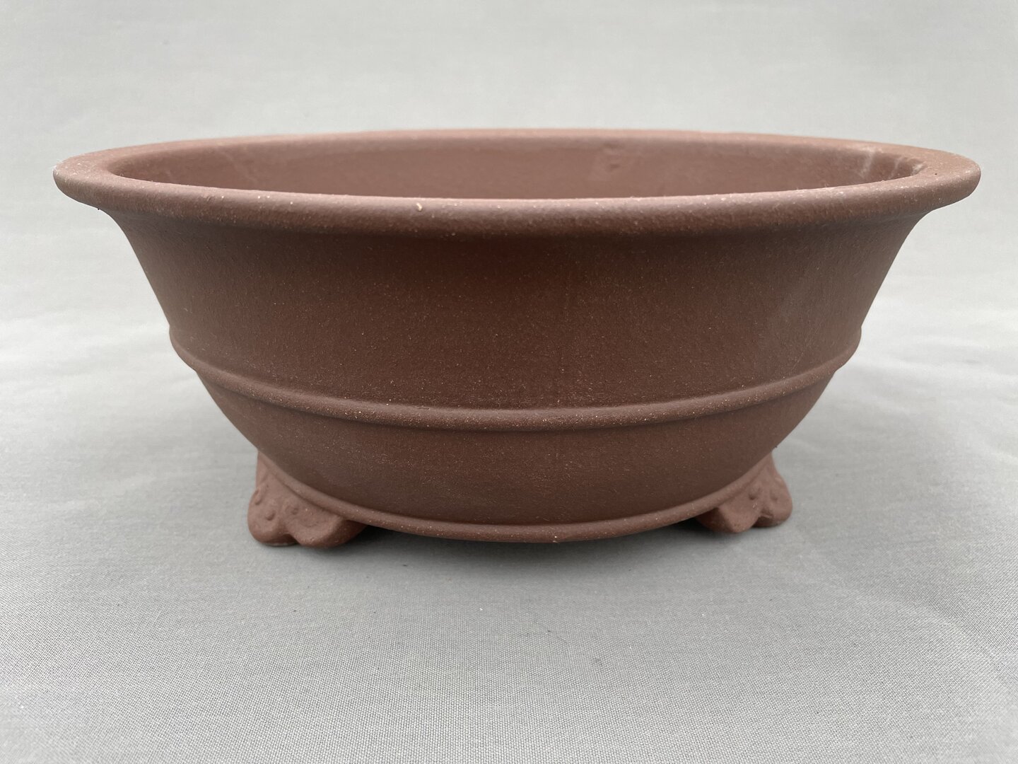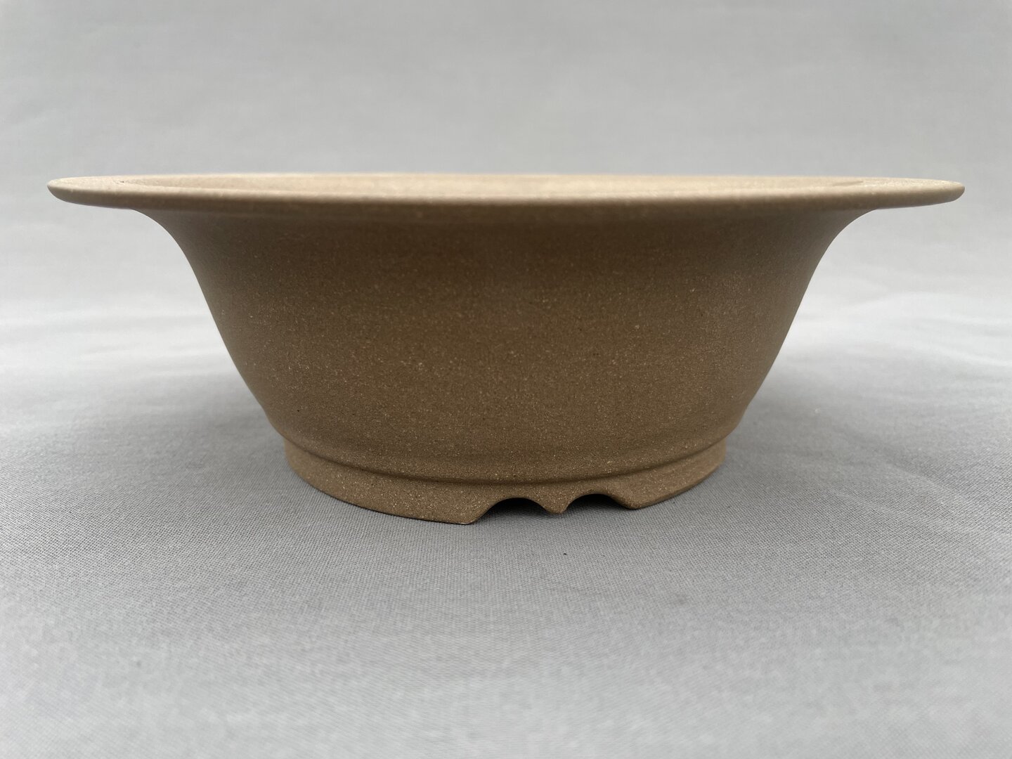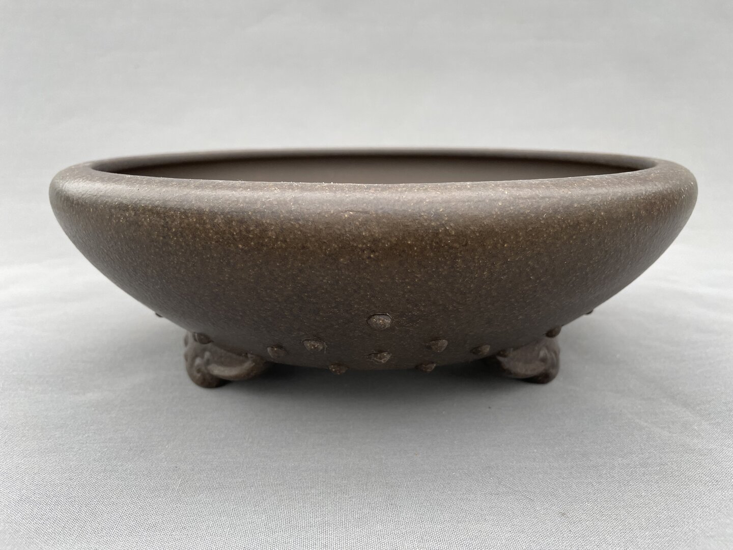 Feine und relativ leichte und dünnwandige, handgetöpferte, hartgebrannte, runde, unglasierte (Halb)kaskadenschale aus braunem Ton, Außendurchmesser 22cm, Höhe außen 18cm