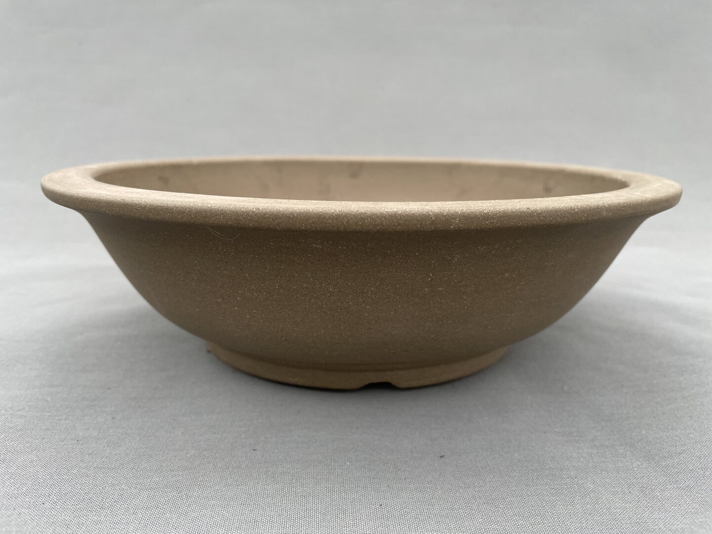 Feine und relativ leichte und dünnwandige, handgetöpferte, hartgebrannte, runde, unglasierte Schale aus ocker-braunem Ton, Außendurchmesser 27cm, Höhe außen 8cm