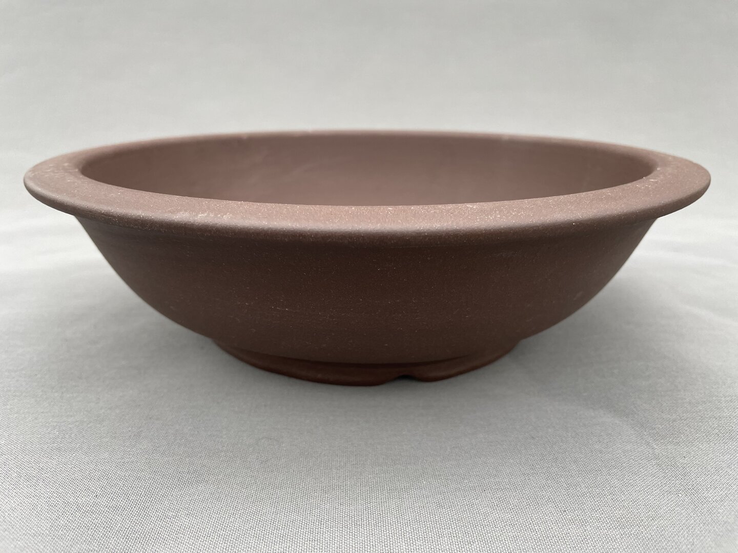 Feine und relativ leichte und dünnwandige, handgetöpferte, hartgebrannte, runde, unglasierte Schale aus leicht rötlichbraunem Ton mit einem seidenmatt glänzenden Finish; Außendurchmesser 29cm, Höhe außen 9,5cm