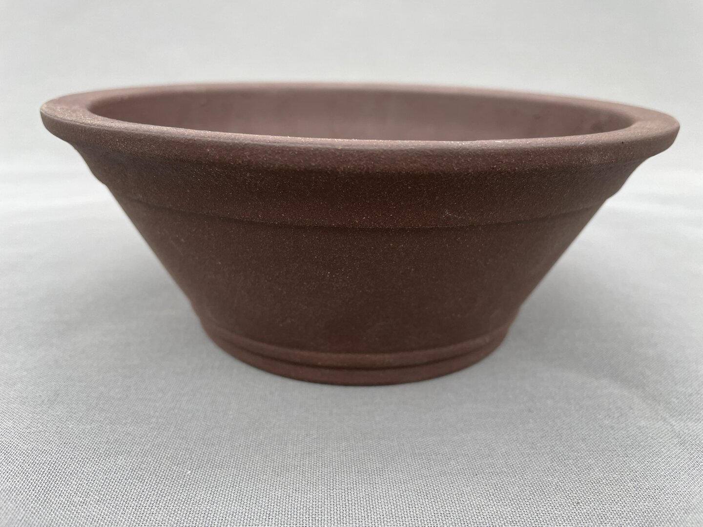 Feine und relativ leichte und dünnwandige, handgetöpferte, hartgebrannte, runde, unglasierte Kaskadenschale aus braunem Ton, Außendurchmesser 13,5cm, Höhe außen 17,8cm