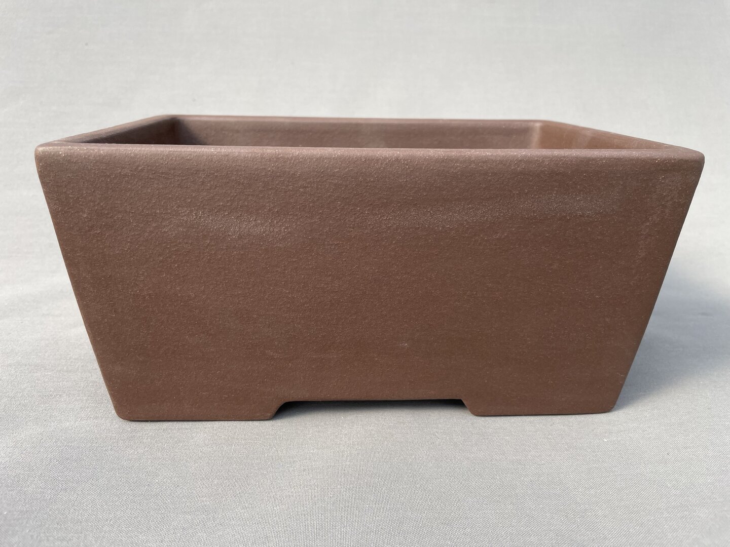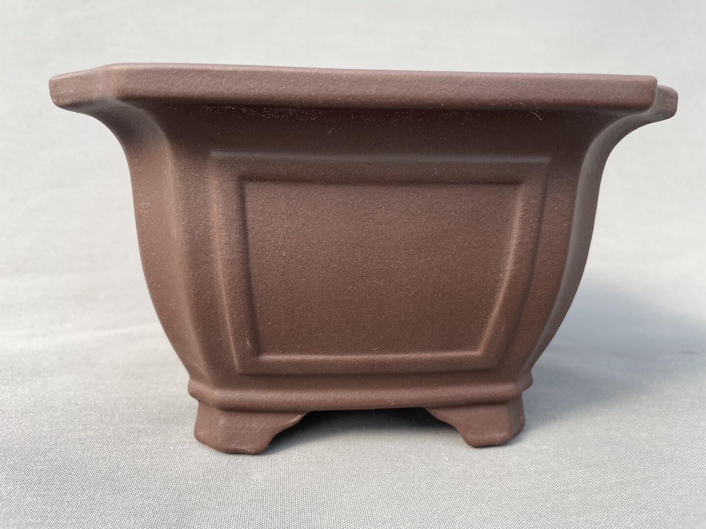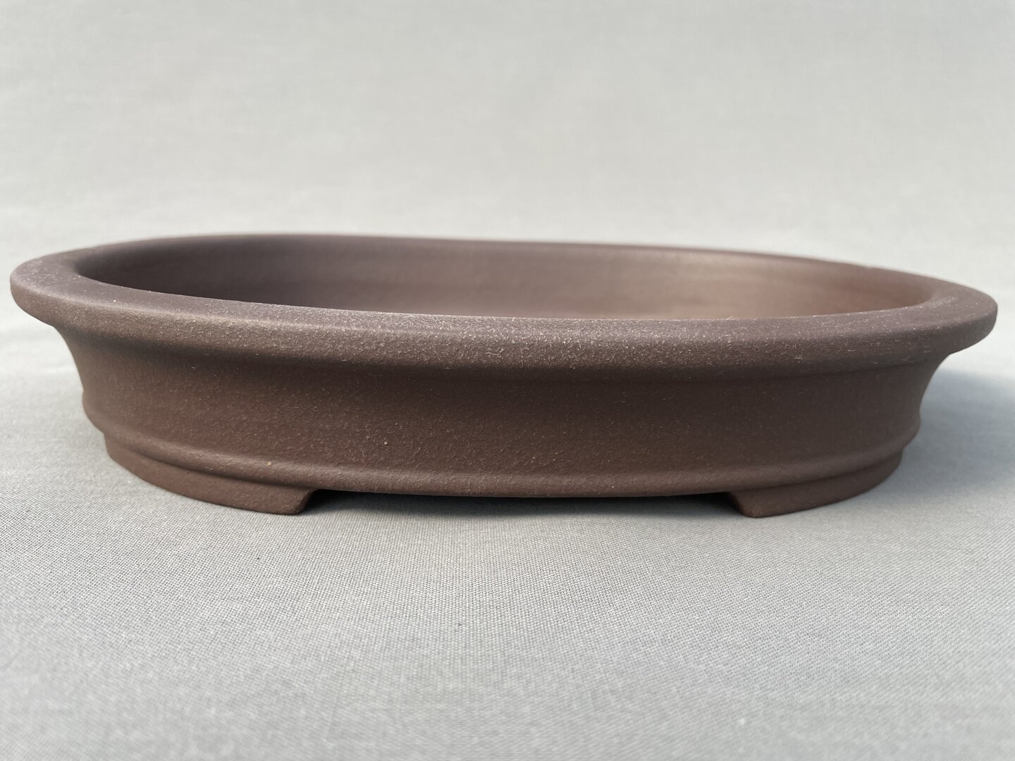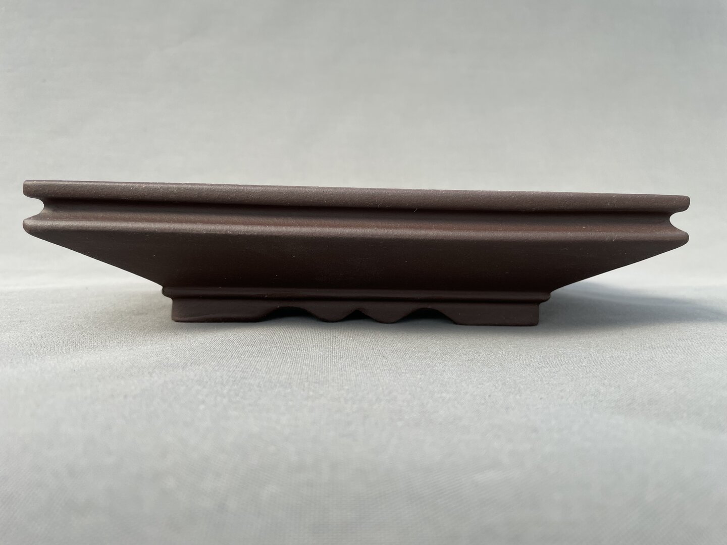 Feine, handgetöpferte, hartgebrannte, betont schlichte,; rechteckige, unglasierte Schale aus dunkelgraubraunem Ton für dickstämmige Bonsai oder als universell geeigneter Topf für Pflanzen mit hohen Wurzelballen; Außendurchmesser 27x18,5x13cm
