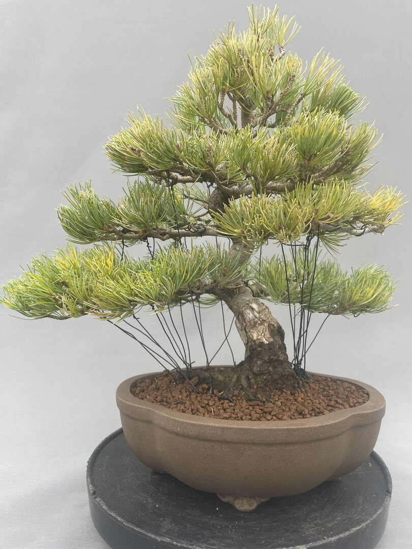 Lehnende, locker gewundene Schwarzkiefer mit gleichmäßiger Verzweigung, deren Wurzeln noch etwas unstrukturiert sind; 2025 wurden zu lange Nadeln beschnitten und der Baum umgepflanzt in eine in Deutschland von Hand überglasierte, handgemachte Yixingschale; Gesamthöhe mit Topf 30cm