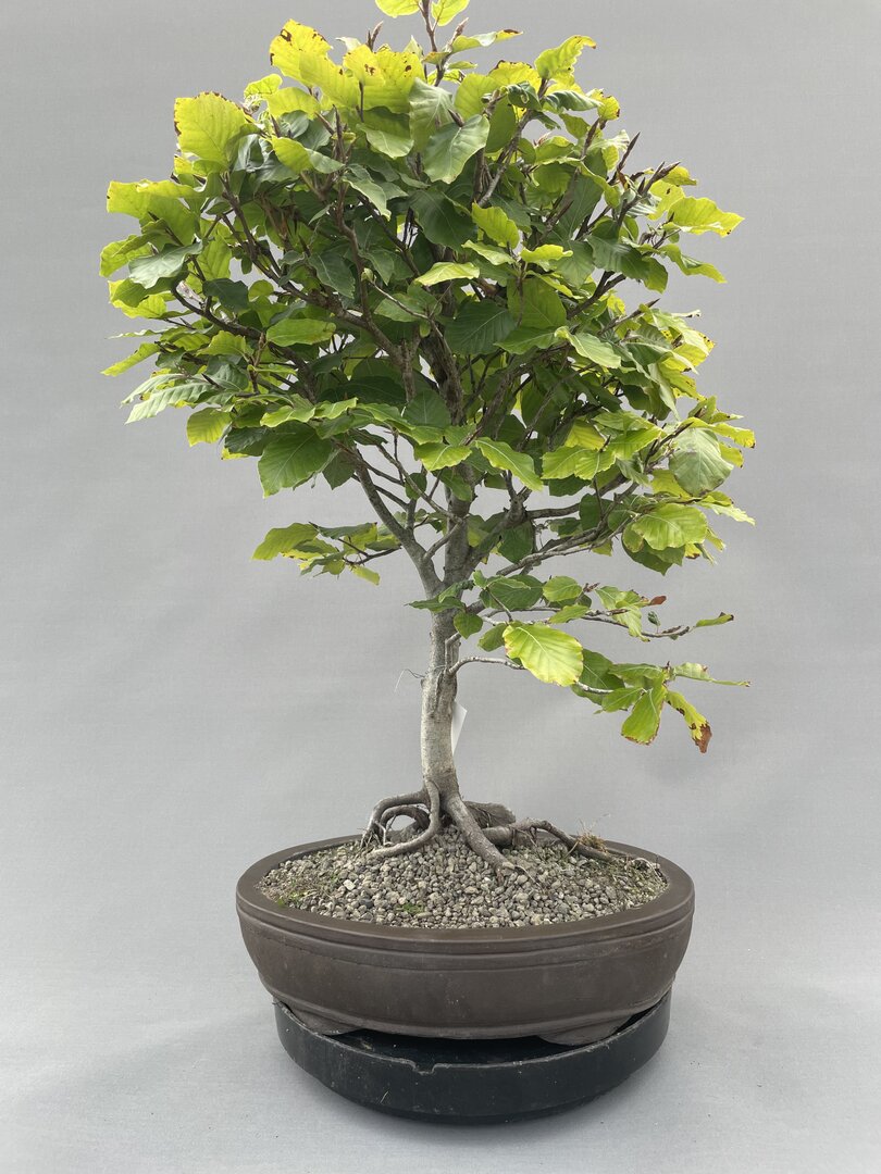 Aufrechte Rotbuche mit sanften Windungen im Stamm, mit recht "wilden" Wurzelansätzen, einer runden, sehr buschigen Krone, schöner Verjüngung und guter Feinverzweigung; ovale, unglasierte Yixingschale, Gesamthöhe mit Schale 68cm Versand innerhalb Deutschlands 12 Euro