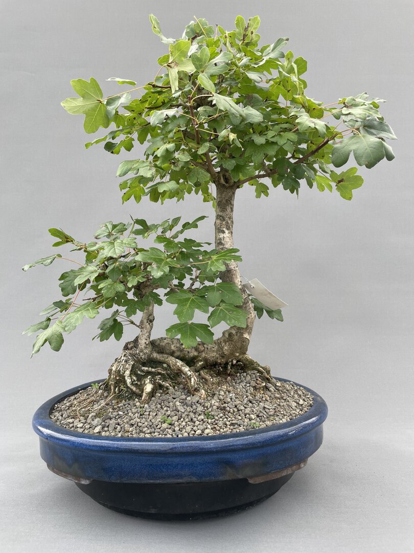 Feldahorngruppe mit einem längeren, sanft gewundenen und einem ganz kurzen, aufrechten Stamm, beide sind über eine große Wurzel miteinander verbunden (relativ gleichmäßige, kräftige und dekorative Wurzelansätze!); die Stämme haben jeweils eine breite, buschige Krone; ovale, leuchtend blau glasierte Yixingschale; Gsamthöhe mit Schale 54cm Versand innerhalb Deutschlands 18 Euro