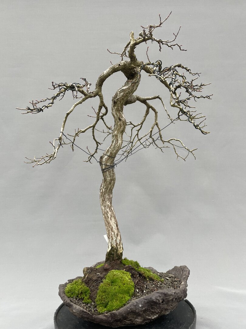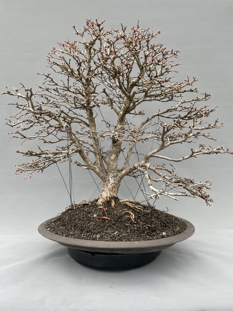 Rund 20 Jahre alter, ganz leicht lehnender, sehr natürlich wirkender Weißdorn, die Wurzelansätze am schlanken, aber schon borkigen Stamm sind schön gleichäßig aufgebaut; die hoch angesetzten Äste sind vom Aufbau und Verzweigung gut; ovaler, vom Bonsaitöpfer Ralf Hauke graugrün überglasierter Yixingtopf; Gesamthöhe mit Schale 56cm Versand innerhalb Deutschlands 14 Euro