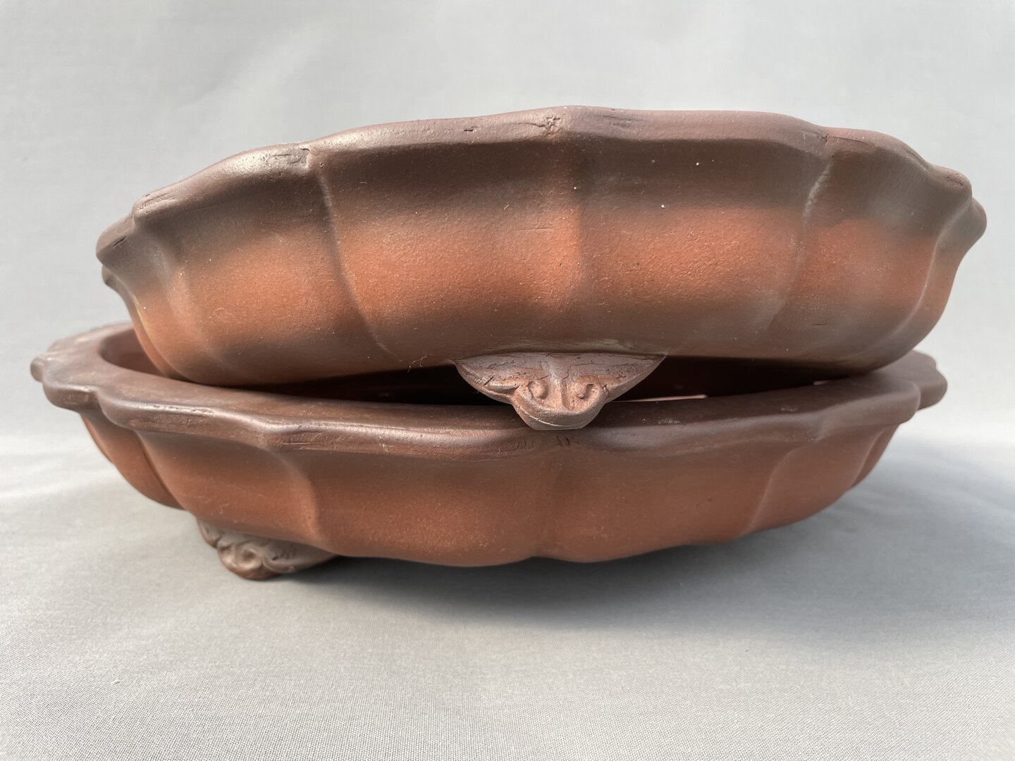 Runde, tiefe, handgefertigte Töpfe aus rotbraunem Ton mit Schnörkelfüßen, gewelltem Rand und Außenwänden in zwei Größen; frostfest, recht rustikal und dickwandig gearbeitet; zum Teil mit kleinen Unregelmäßigkeiten in der Oberfläche und herstellungsbedingten, dunklen Flecken auf dem oberen Rand (siehe Foto)