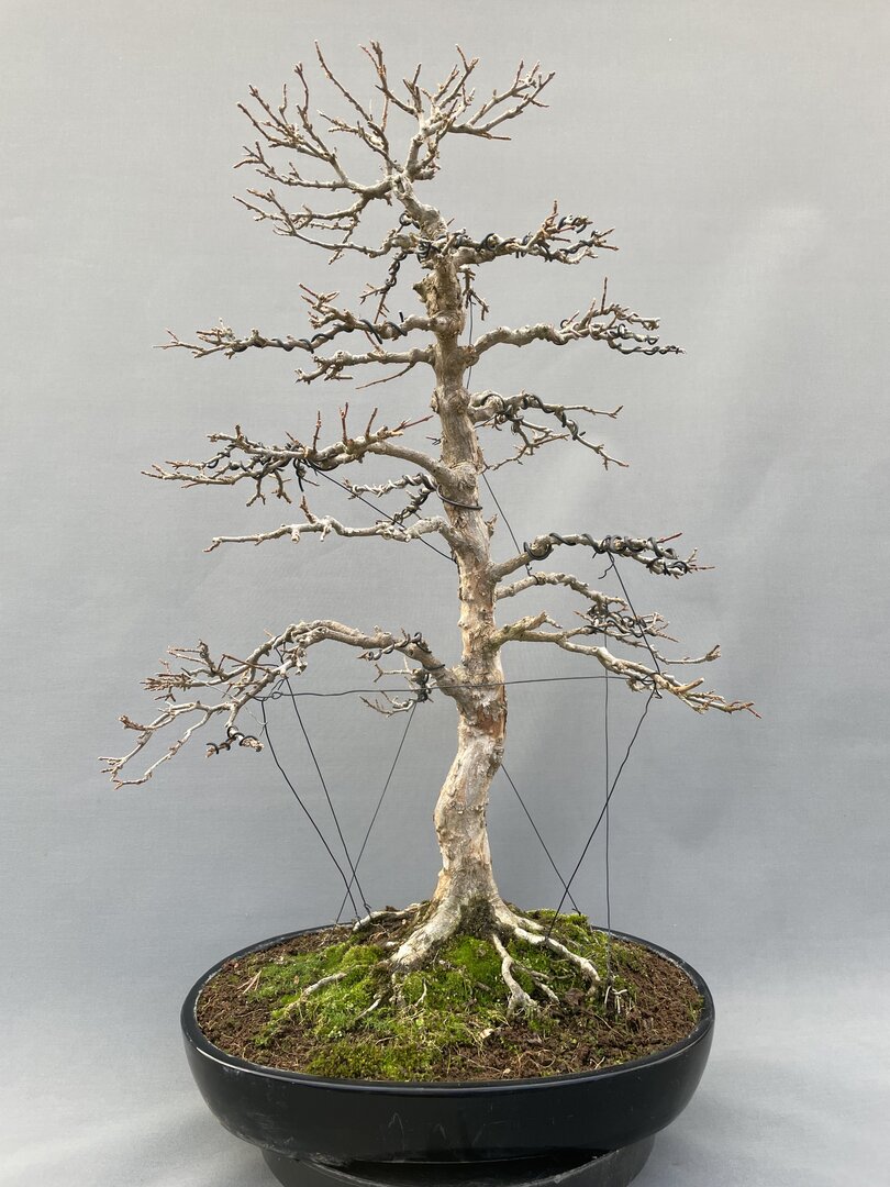 Ein tragisches Schicksal hat dieser tolle Dreispitzahorn mit dem wirklich schönen Nebari (Wurzelansatzbereich) erlitten - begründet im Schicksal des vorherigen Besitzers. Im Sommer 2024 mußte der Baum deshalb zu lange ohne Wasser auskommen und hat einiges an Substanz verloren. Hat aber nach viel Zuwendung dann doch noch mal ausgetrieben, wenn auch nicht überall: drei kleinere Äste im mittleren, rechten und hinteren Kronenbereich sind verloren. Da der Ahorn in den Vorjahren kaum regelmäßig beschnitten wurde hat an manchen Stellen auch die innere Feinverzweigung gelitten, ist an einem Ast gar nicht mehr vorhanden. Anspruchsvolle Gestalter würden später vielleicht Teile der Baumkrone nach einem Rückschnitt neu aufbauen. Bei diesem Projekt lohnenswert! Das neue Drahten im Dezember 2025 hat richtig viele Prspeltiven erkennbar gemacht, s. Fotos! Hochwertige, nachtblau glasierte Japanschale mit ein paar Kratzern; Gesamthöhe mit Schale 75cm Versand ohne Berechnung