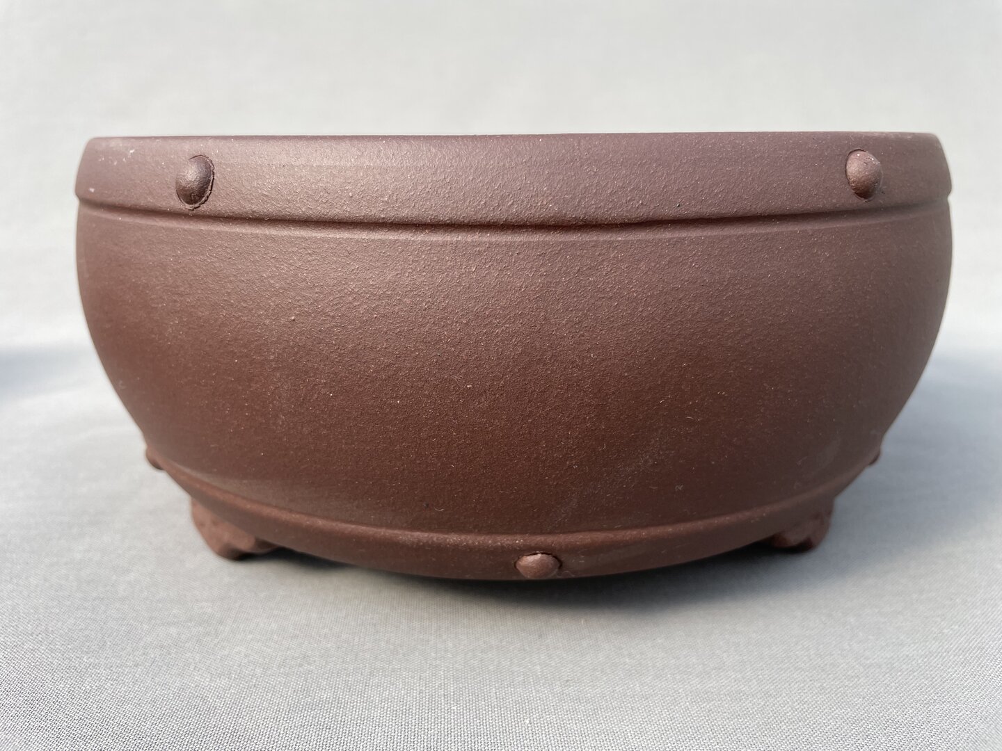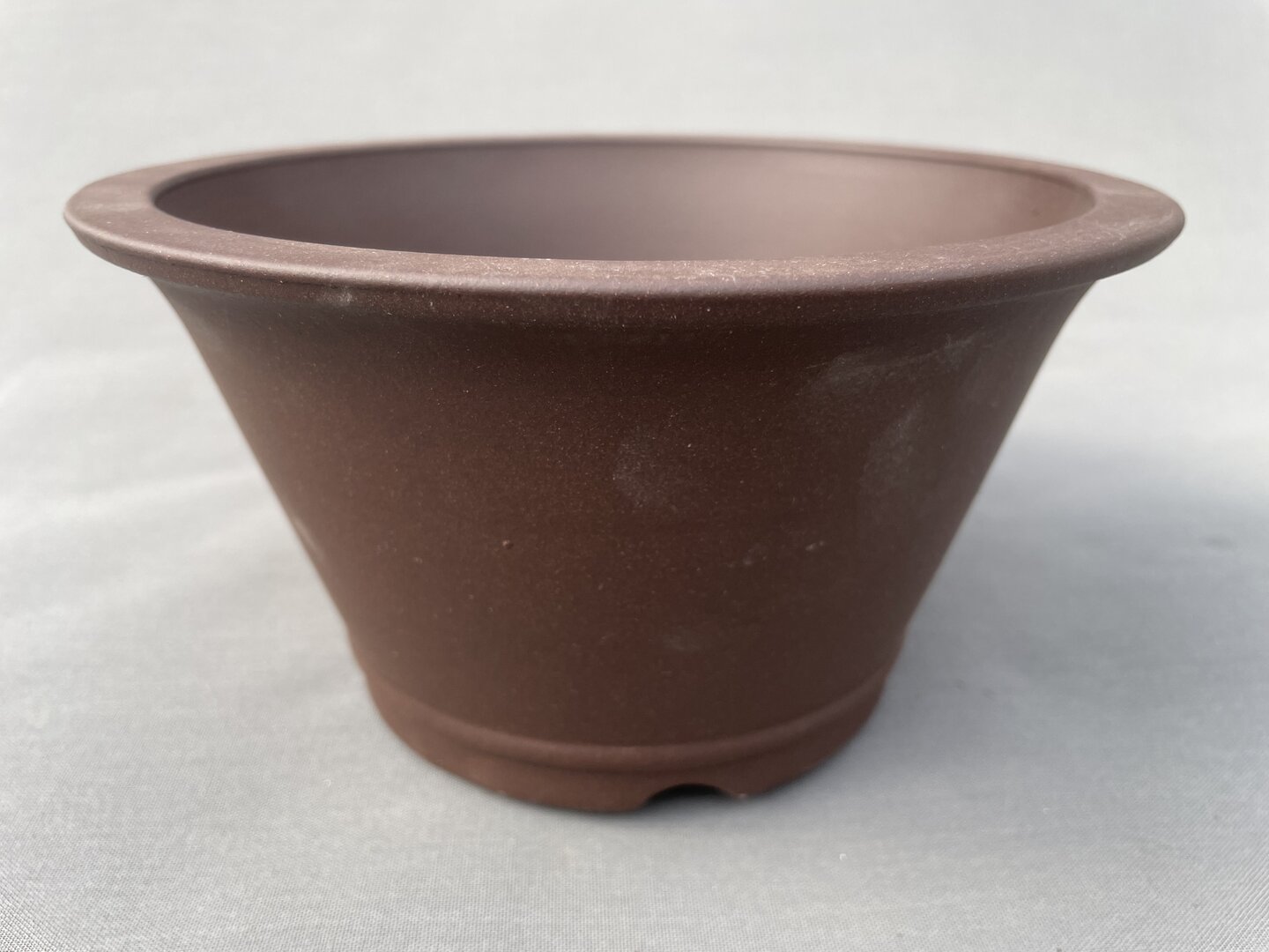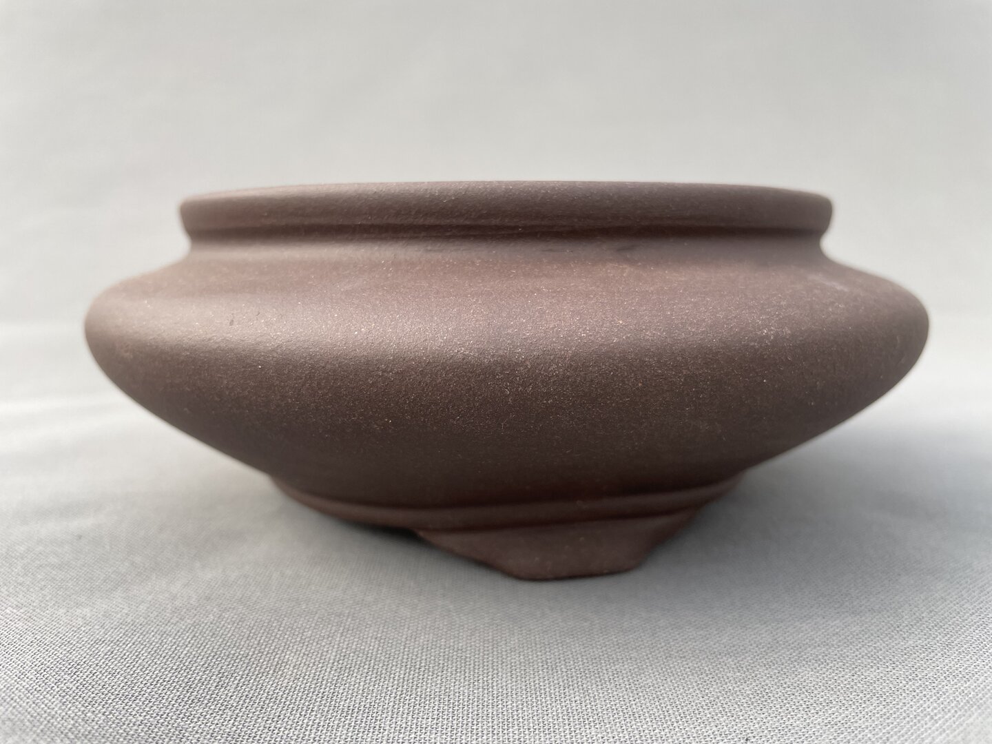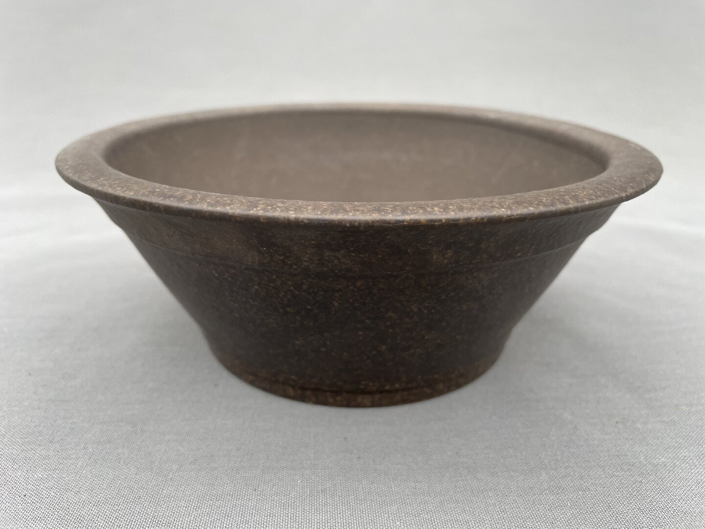 Feine und relativ leichte und dünnwandige, handgetöpferte, hartgebrannte, runde, unglasierte Kaskadenschale aus braunem Ton, Außendurchmesser 13,5cm, Höhe außen 17,8cm