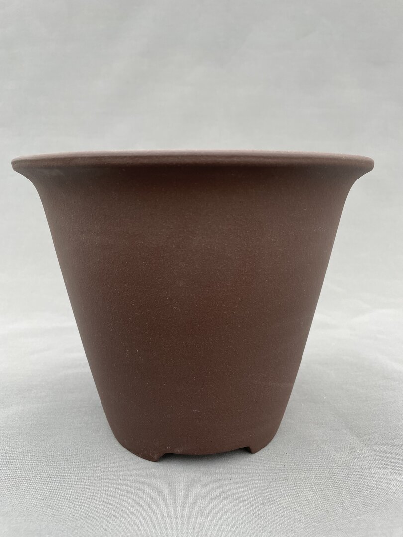 Feine und relativ leichte und dünnwandige, handgetöpferte, hartgebrannte, runde, unglasierte Kaskadenschale aus rotbraunem Ton, Außendurchmesser 8,5cm, Höhe außen 16,5cm