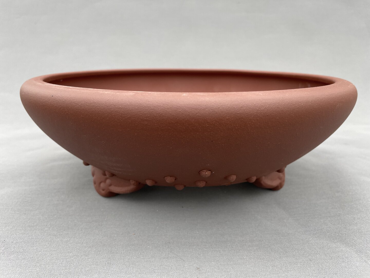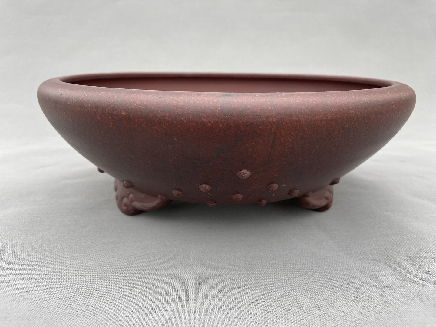 Feine und relativ leichte und dünnwandige, handgetöpferte, hartgebrannte, runde, unglasierte Schale aus rotbraunem Ton mit einem seidenmatt glänzenden Finish; Außendurchmesser 29cm, Höhe außen 9,5cm