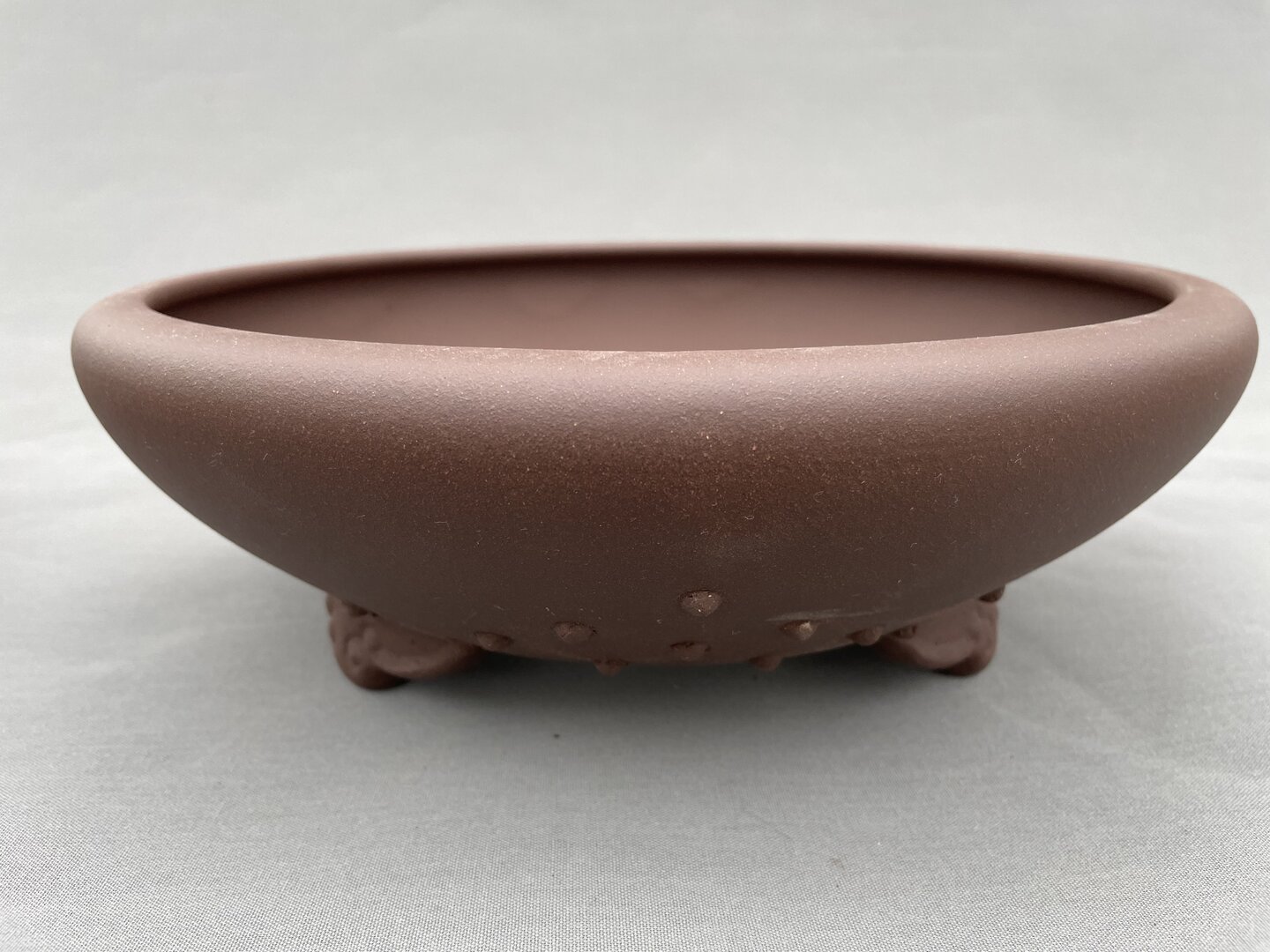 Feine und relativ leichte und dünnwandige, handgetöpferte, hartgebrannte, runde, unglasierte Schale aus leicht rötlichbraunem Ton mit einem seidenmatt glänzenden Finish; Außendurchmesser 29cm, Höhe außen 9,5cm