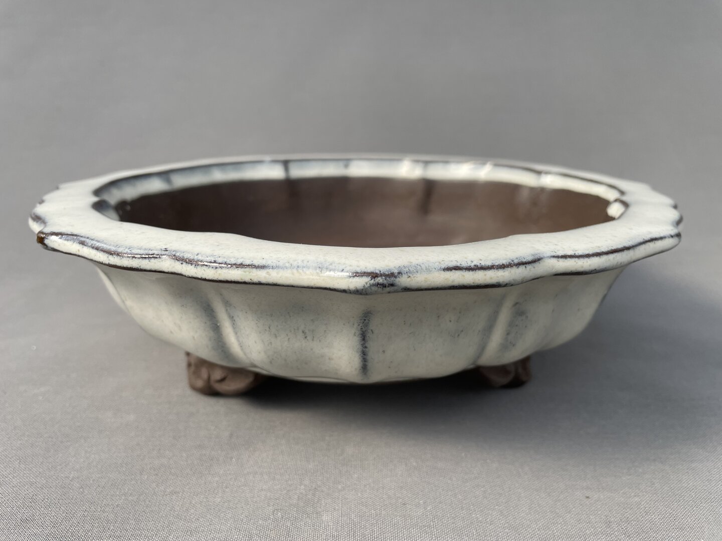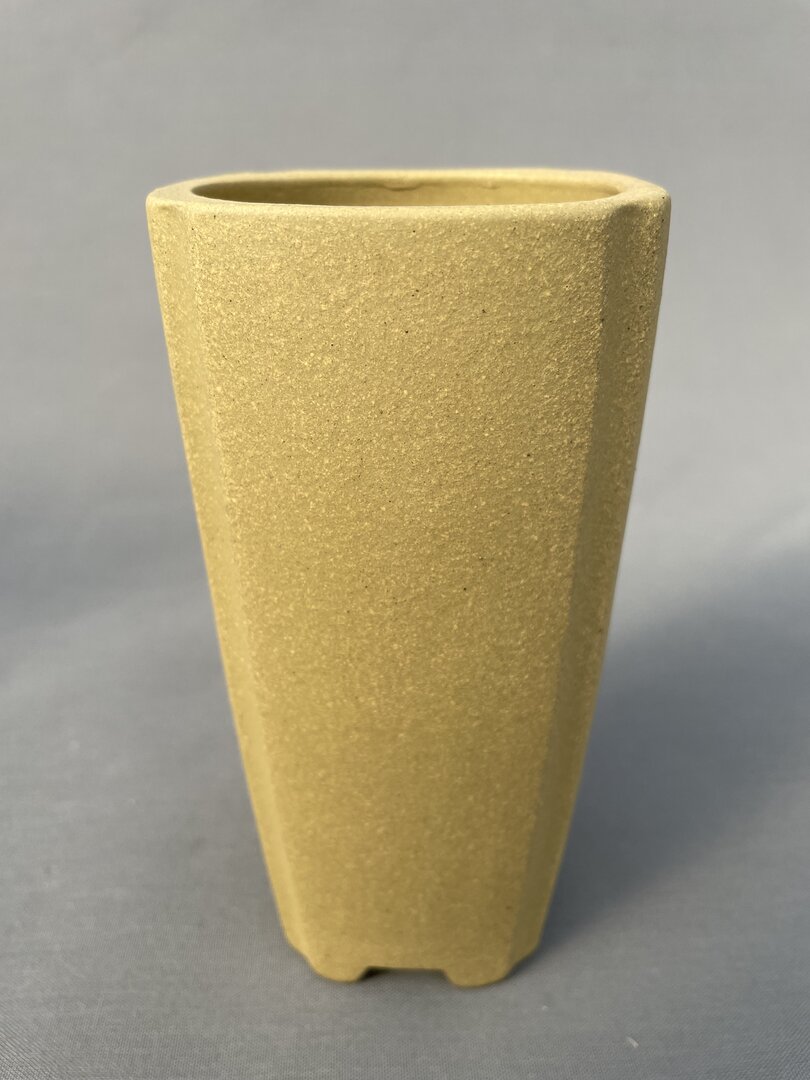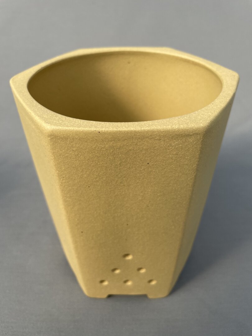 Feine und relativ leichte und dünnwandige, handgetöpferte, hartgebrannte, sechseckige, unglasierte Kaskadenschale aus blassgelblichem Ton; ein sehr sinnvolles, besonderes Merkmal sind drei Gruppen von jeweils 6 kleinen, zusätzlichen Drainage- und Belüftungslöchern im unteren Seitenwandbereich; Außendurchmesser 14/13cm, Höhe außen 17,5cm