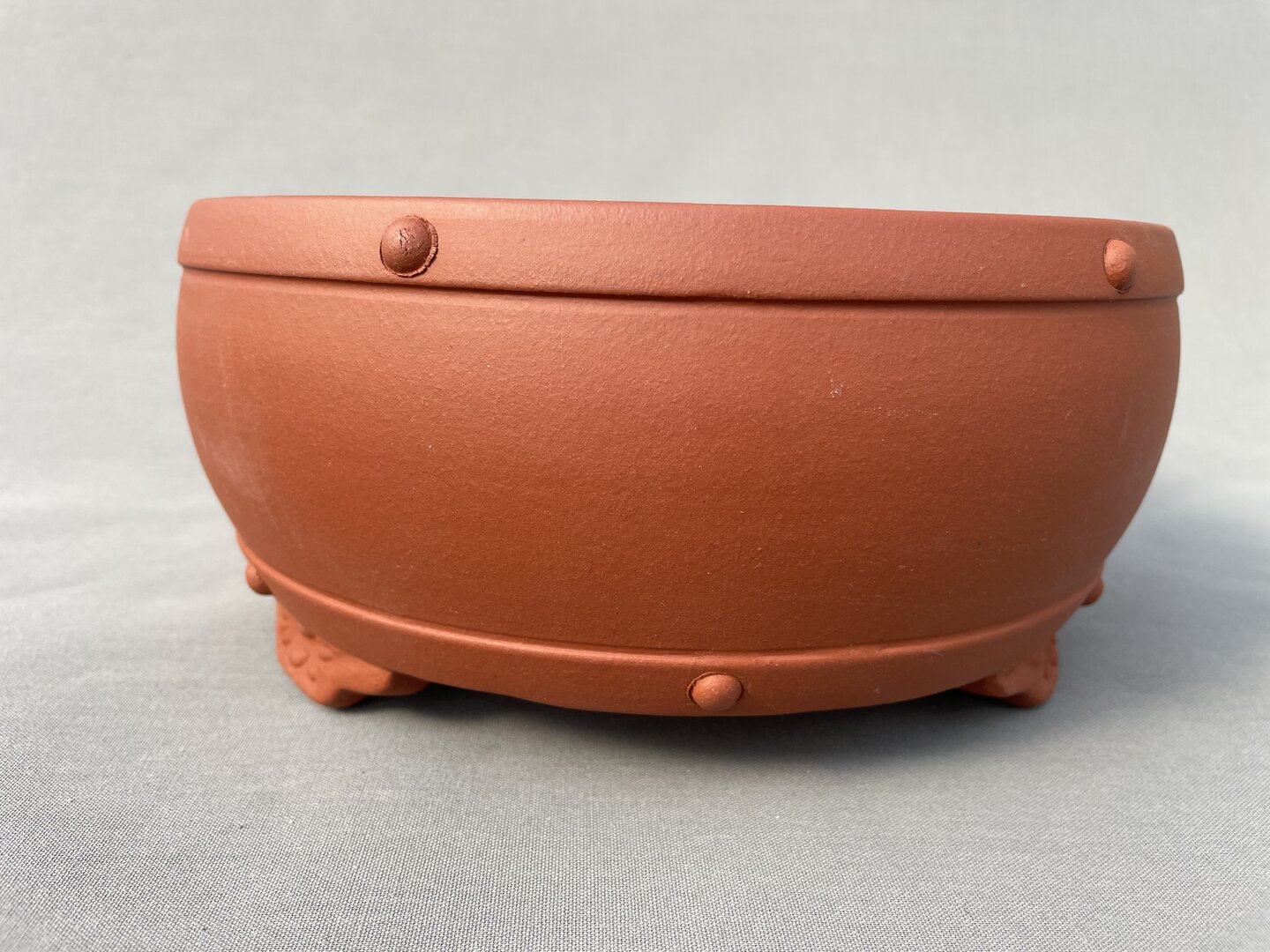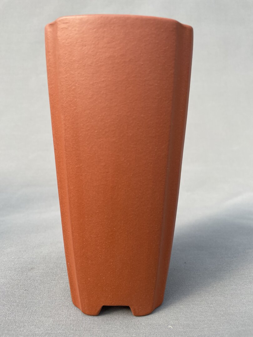 Feine und relativ leichte und dünnwandige, handgetöpferte, hartgebrannte, runde, unglasierte Kaskadenschale aus rotbraunem Ton, Außendurchmesser 10,5cm, Höhe außen 21,5cm