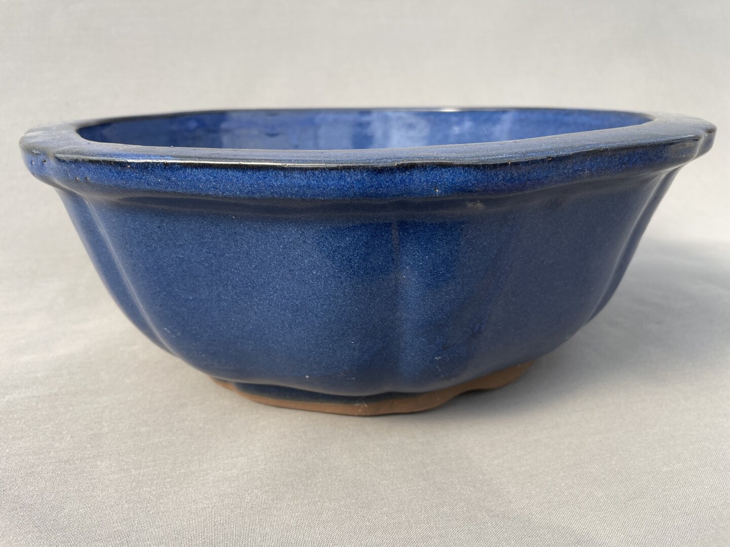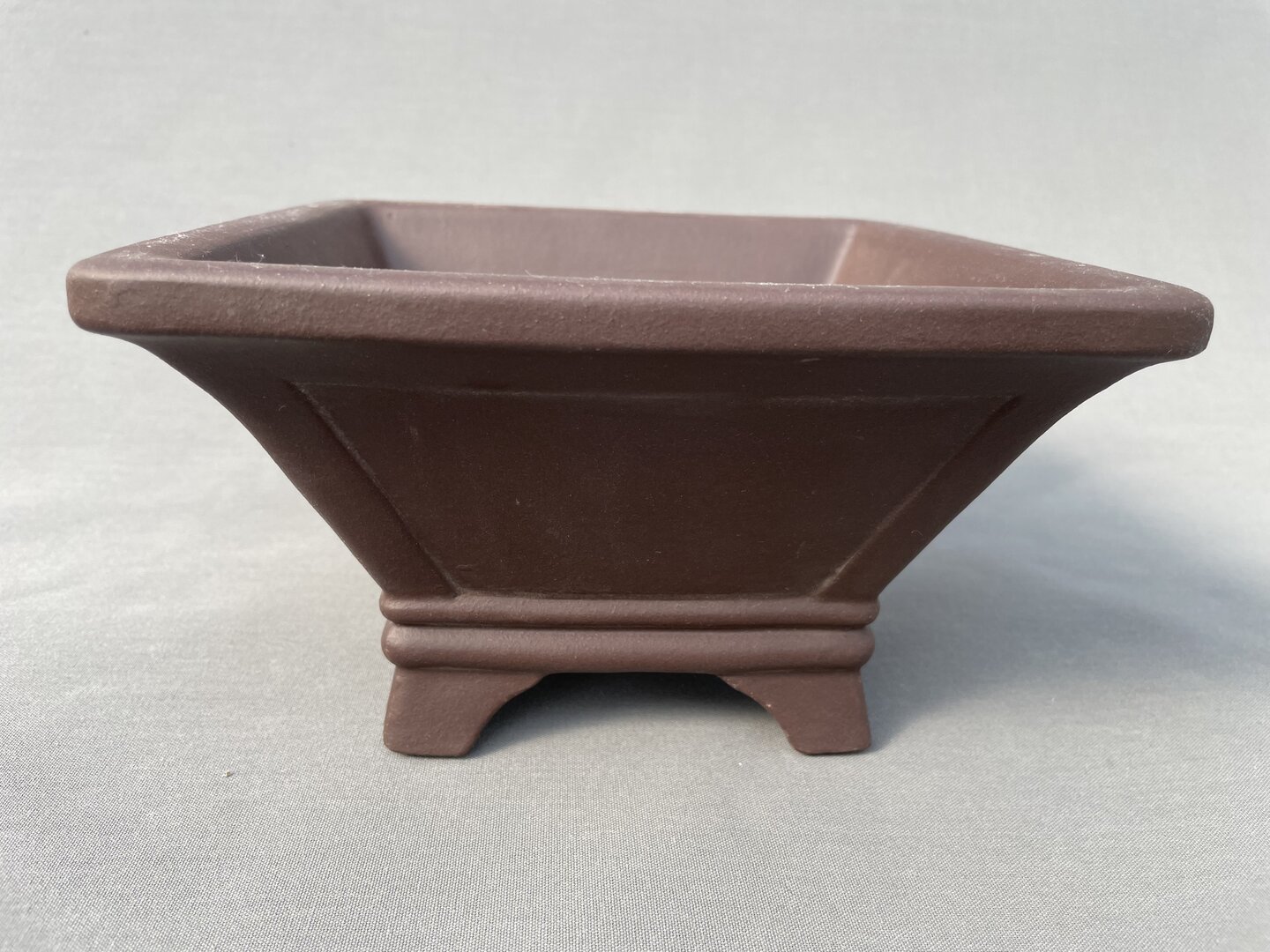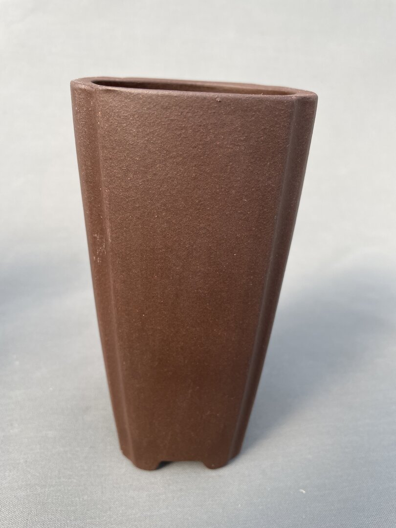 Feine und relativ leichte und dünnwandige, handgetöpferte, hartgebrannte, sechseckige, unglasierte Kaskadenschale aus dunkelbraunem Ton; ein sehr sinnvolles, besonderes Extra sind drei Gruppen von jeweils 6 kleinen, zusätzlichen Drainage- und Belüftungslöchern im unteren Seitenwandbereich; Außendurchmesser 14/13cm, Höhe außen 17,5cm