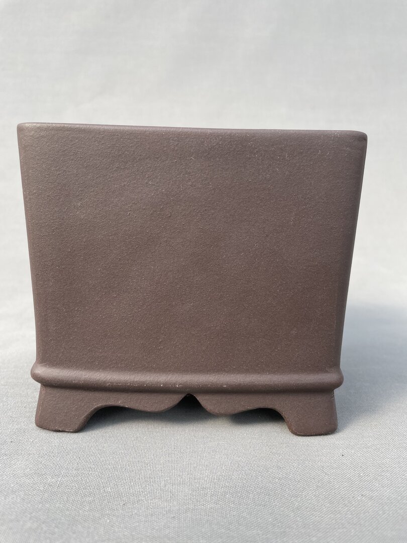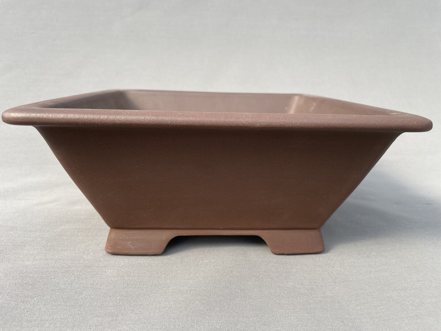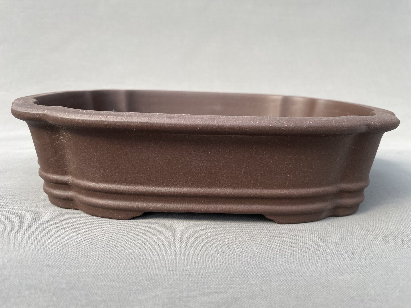 Feine, handgetöpferte, hartgebrannte, betont schlichte,; rechteckige, unglasierte Schale aus dunkelgraubraunem Ton für dickstämmige Bonsai oder als universell geeigneter Topf für Pflanzen mit hohen Wurzelballen; Außendurchmesser 27x18,5x13cm