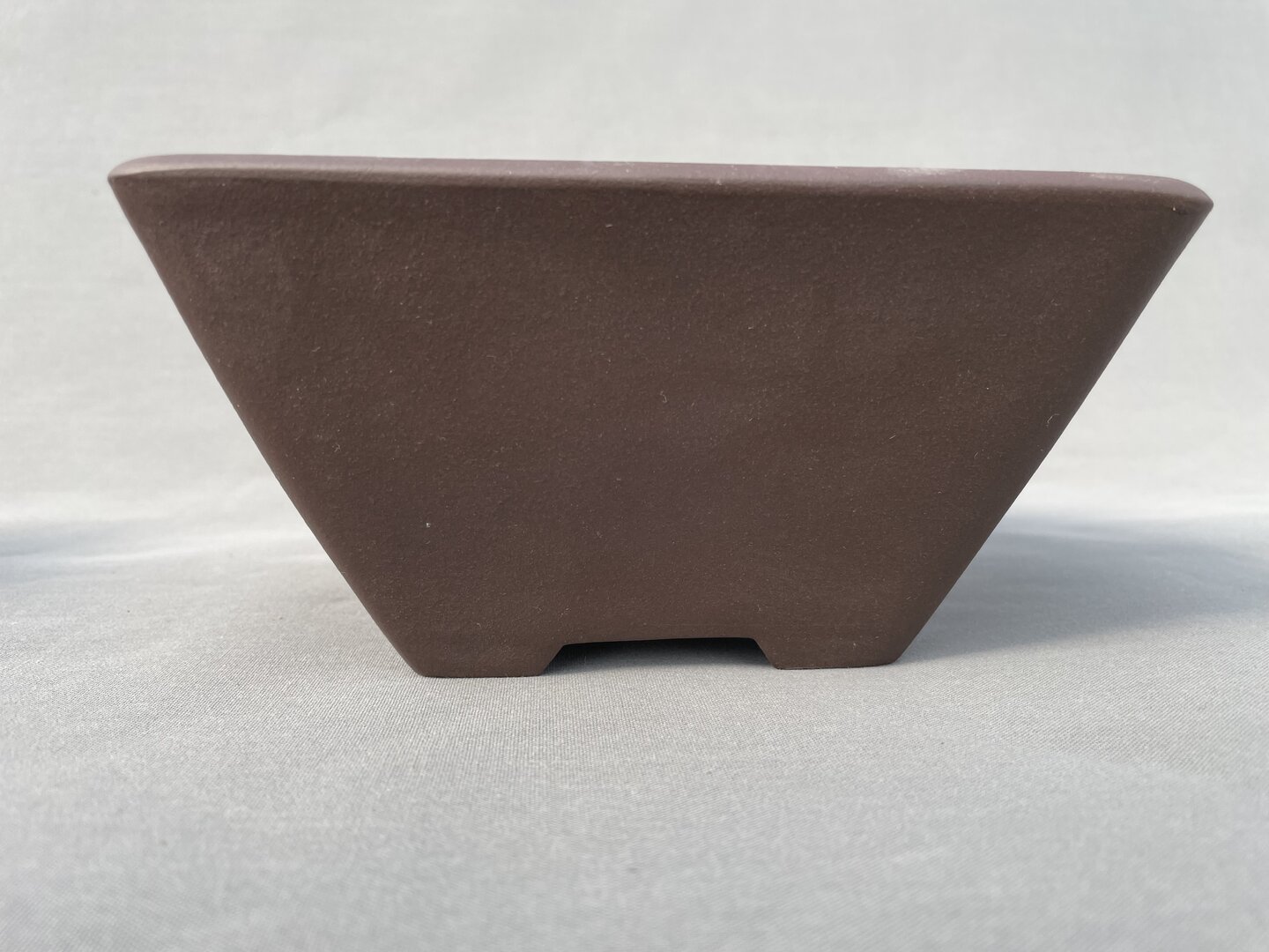 Feine, handgetöpferte, hartgebrannte, quadratische, unglasierte Schale aus dunkelgraubraunem Ton ; Außendurchmesser 20,5cm; Höhe außen 12cm