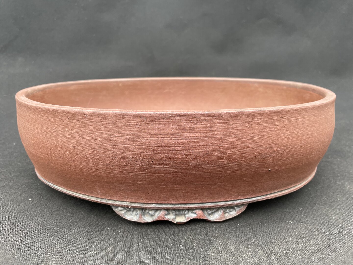 komplett von Hand aufgebautes Unikat; ovale, unglasierte Schale aus rotbraunem Ton mit Wölkchenfüßen; möglicherweise gebraucht, aber ohne Gebrauchsspuren; Außenmaße 30 x 23,5 x8,8cm