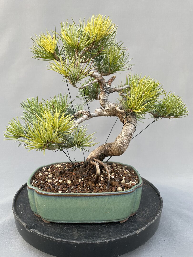 Kompakte, aber kräftige, stark gewundene, gepfropfte Mädchenkiefer mit dichten Astpolstern; nur an einer Stelle eine oberflächliche Drahtspur; handgemachtes Schalenunikat in freier Form mit einseitig abgeplaztem Rand (letztes Foto), was aber kaum auffällt; Gesamthöhe mit Schale 25cm