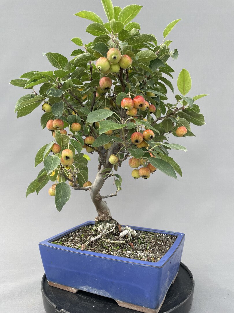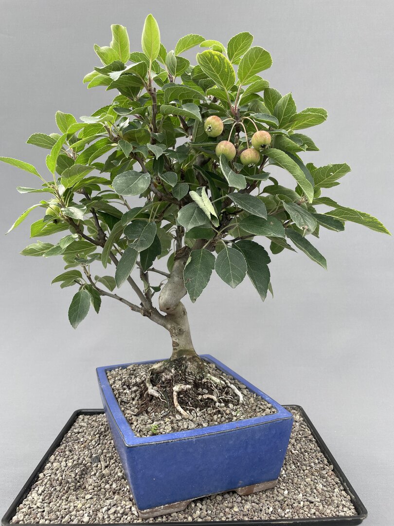Lebhaft gewundener Zierapfel mit kräftigem Stamm und etwas wilden, aber herrlich knorrigen Wurzelansätzen; schön verzweigt und buschig; ovale, blau glasierte Yixingschale; Gesamthöhe mit Topf 42cm
