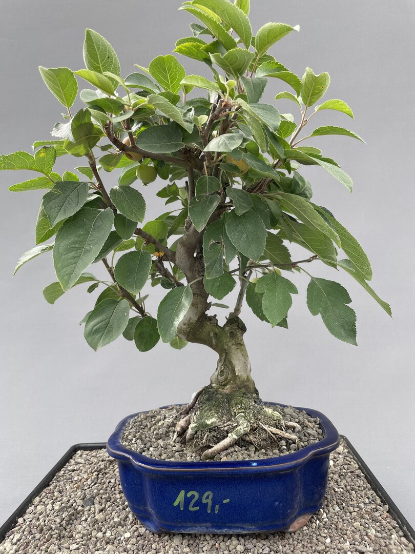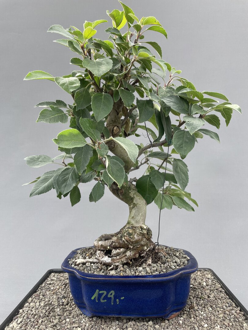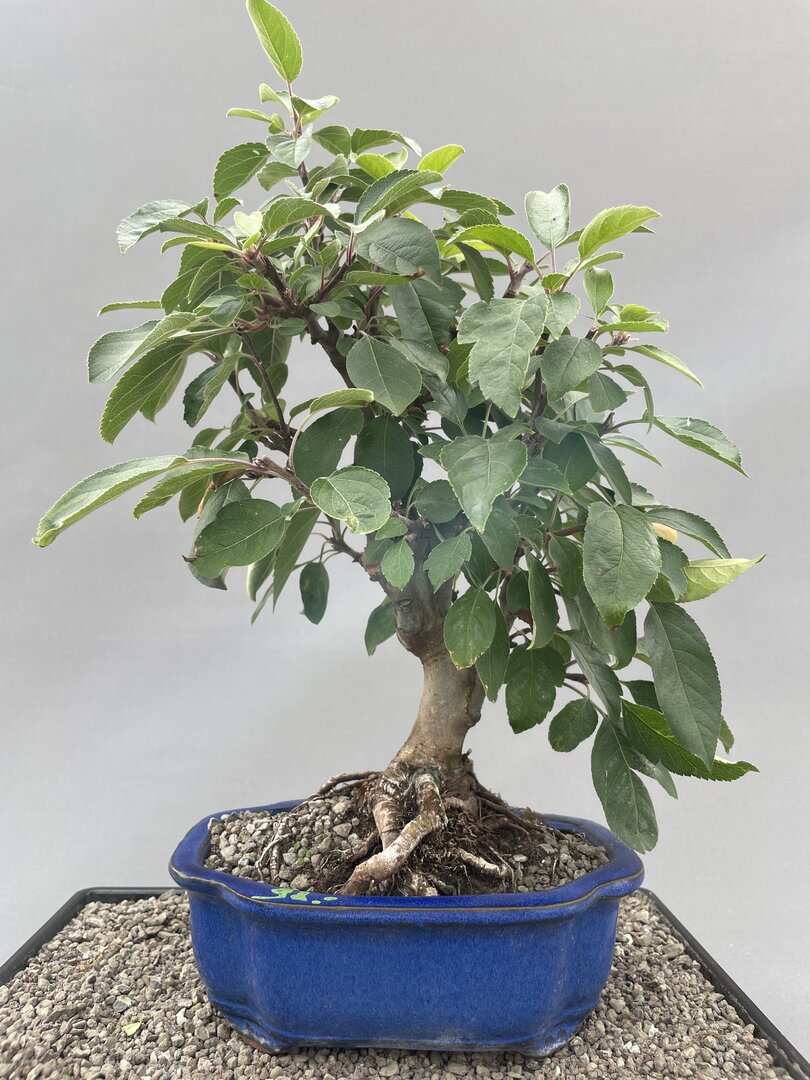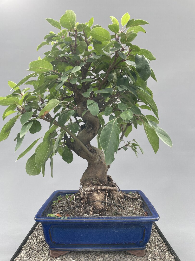 Lebhaft gewundener Zierapfel mit super-kräftigem Stamm und etwas wilden, aber herrlich knorrigen Wurzelansätzen; schön verzweigt und buschig; rechteckige, blau glasierte Yixingschale; Gesamthöhe mit Topf 49cm