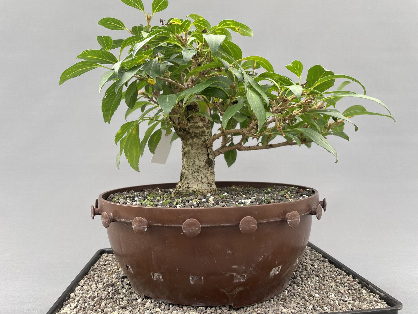 25-30-jähriger Spindelstrauch, aufrecht mit einigen Windungen; sehr gutes Nebari (Wurzelansatzbereich) auf der Vorderseite, hinten immer noch gut; zahlreiche zuheilende Schnittstellen am Stamm; dessen Äste relativ weit oben beginnen; im oberen Kronenbereich wurden Äste für die Baumspitze aufgebaut - dadurch keine perfekt gleichmäßige Verjüngung; Ovale, handgemachte, grün glasierte Yixingschale; Gesamthöhe mit Schale 72cm Versand innerhalb Deutschlands 18 Euro