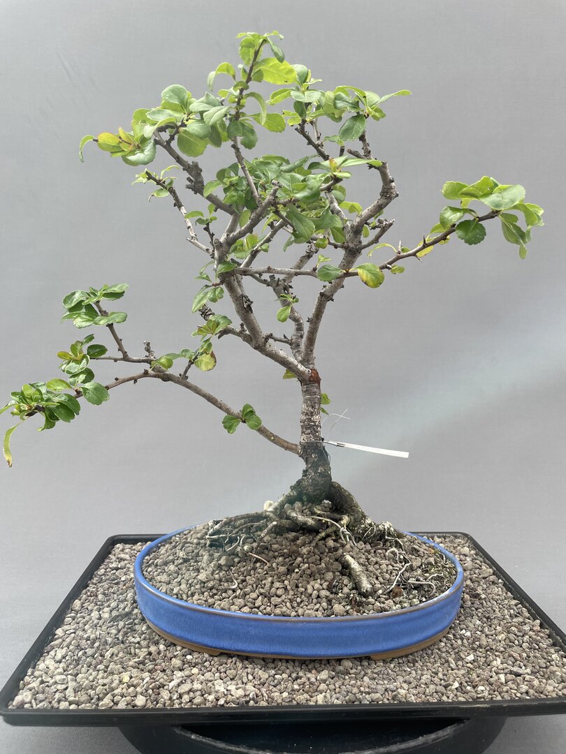 Rund 20 Jahre alter, ganz leicht lehnender, sehr natürlich wirkender Weißdorn, die Wurzelansätze am schlanken, aber schon borkigen Stamm sind schön gleichäßig aufgebaut; die hoch angesetzten Äste sind vom Aufbau und Verzweigung gut; ovaler, vom Bonsaitöpfer Ralf Hauke graugrün überglasierter Yixingtopf; Gesamthöhe mit Schale 56cm Versand innerhalb Deutschlands 14 Euro