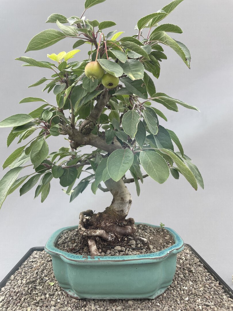 Lebhaft gewundener Zierapfel mit kräftigem Stamm und etwas wilden, aber herrlich knorrigen Wurzelansätzen; schön verzweigt und buschig; ovale, türkisfarben glasierte Yixingschale; Gesamthöhe mit Topf 38cm