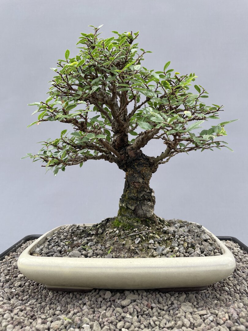 Fast perfekte, aufrechte Zelkove mit runder, sehr fein verzweigter Baumkrone und mit wunderbar aufgebautem Wurzelansatzbereich: die japanische, korkrindige Zelkove (nicht zu verwechseln mit der immergrünen chinesischen Ulme/Zelkove) ist so beliebt wegen ihrer extrem borkigen Rinde, sie ist winterkahl, verträgt durchaus einigen Frost, sollte aber beim Drahten äußerst vorsichtig behandelt werden, weil sie (auch im Wurzelbereich) sehr zerbrechlich ist; flache, rechteckige, cremefarben glasierte Japanschale; Höhe mit Schale 28cm