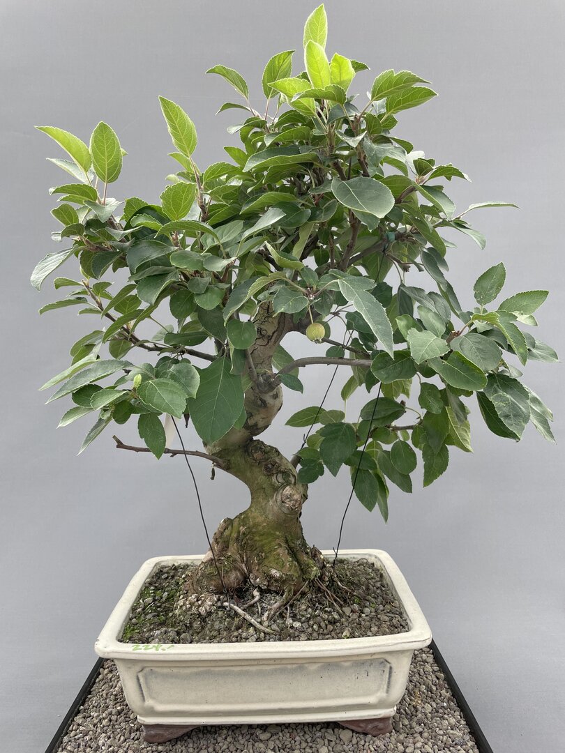 Lebhaft gewundener Zierapfel mit super-kräftigem Stamm und etwas wilden, aber herrlich knorrigen Wurzelansätzen; schön verzweigt und buschig; rechteckige, cremefarben glasierte Yixingschale; Gesamthöhe mit Topf 50cm