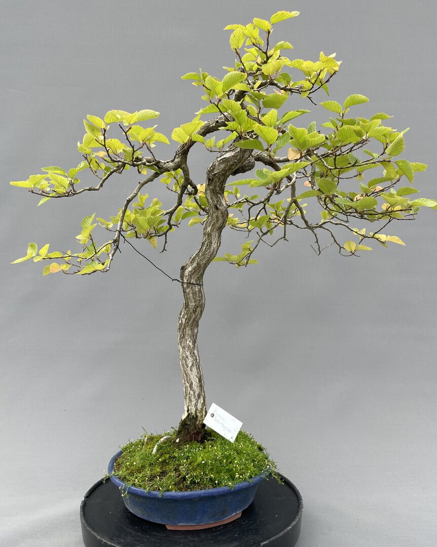 Hochbeinige, sicher schon 15-20-jährige, filigrane Koreahainbuche in klassischer Literatenform; attraktiver Wurzelansatzbereich; elegant gewundener Stamm mit kräftigen Ästen, die eine momentan etwas unstrukturierte, schirmförmige Krone bilden mit noch nicht perfekter Feinverzweigung; knapp bemessene, runder blau glasierte Yixingschale; Gesa,thöhe mit Schale 58cm