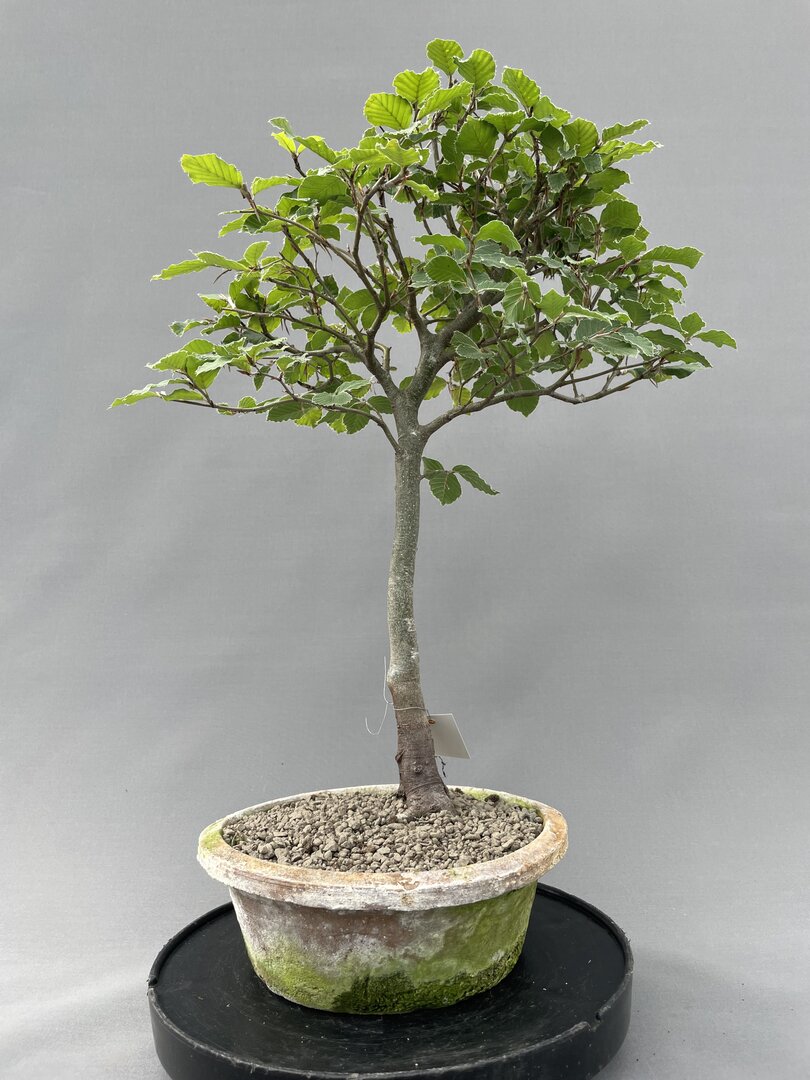Aufrechte Rotbuche mit sanften Windungen im Stamm, mit recht "wilden" Wurzelansätzen, einer runden, sehr buschigen Krone, schöner Verjüngung und guter Feinverzweigung; ovale, unglasierte Yixingschale, Gesamthöhe mit Schale 68cm Versand innerhalb Deutschlands 12 Euro