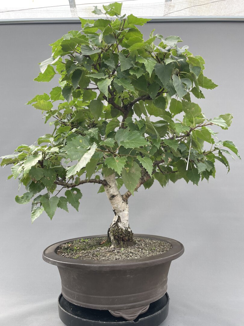 Dreistämmige Birke, rund 15 Jahre alt mit bereits weißer werdender Rinde; recht gleichmäßig aufgebauter Wurzelansatzbereich; gut verzweigt; sehr hochwertige, rechteckige, grün glasierte Koreaschale; Gesamthöhe mit Schale 65cm; Kronendurchmesser max. 55cm