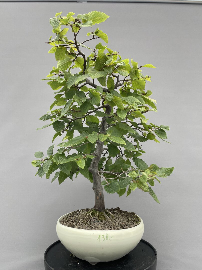 Informell aufrechte Hainbuche mit wunderbar gleichmäig aufgebautem, kräftigen Wurzelansatzbereich, schönen Stammbewegungen und buschiger, runder Baumkrone. Hainbuchen sind im Sommer am besten halbschattig im Garten aufgehoben und nicht auf einem Balkon, weil sie dort anfällig für Spinnmilben sind; auch Mehltau kann bei kühlem, feuchtem Wetter ein Problem sein; cremefarben glasierte, hochwertige Japanschale; Gesamthöhe mit Schale 58cm
