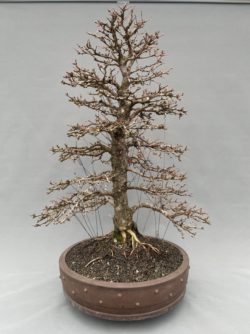 Eine gewaltige, kräftige, nicht ganz streng aufrechte, rund 20-25-jährige Lärche; etwas wilde und noch wenig strukturierte Wurzelansätze; allseitig gleichmäßiger Astaufbau mit beginnender Feinverzweigung: der Baum stand bis zum Frühjahr 2025 im Beet, wo er konsequent alle zwei Jahre "verschult", also umstochen und an den Wurzeln beschnitten wurde, dann das erste Mal getopft und hat nun das erste Jahr im echten "Bonsaileben" hinter sich hat; er wurde im Frühling 2026 durchgestaltet und in eine runde, handgemachte Yixing-Trommelschale verpflanzt; Gesamthöhe mit Schale 89cm Versandkosten OHNE Keramikschale OHNE BERECHNUNG, mit Schale per Spedition innerhalb Deutschlands 60-70 Euro