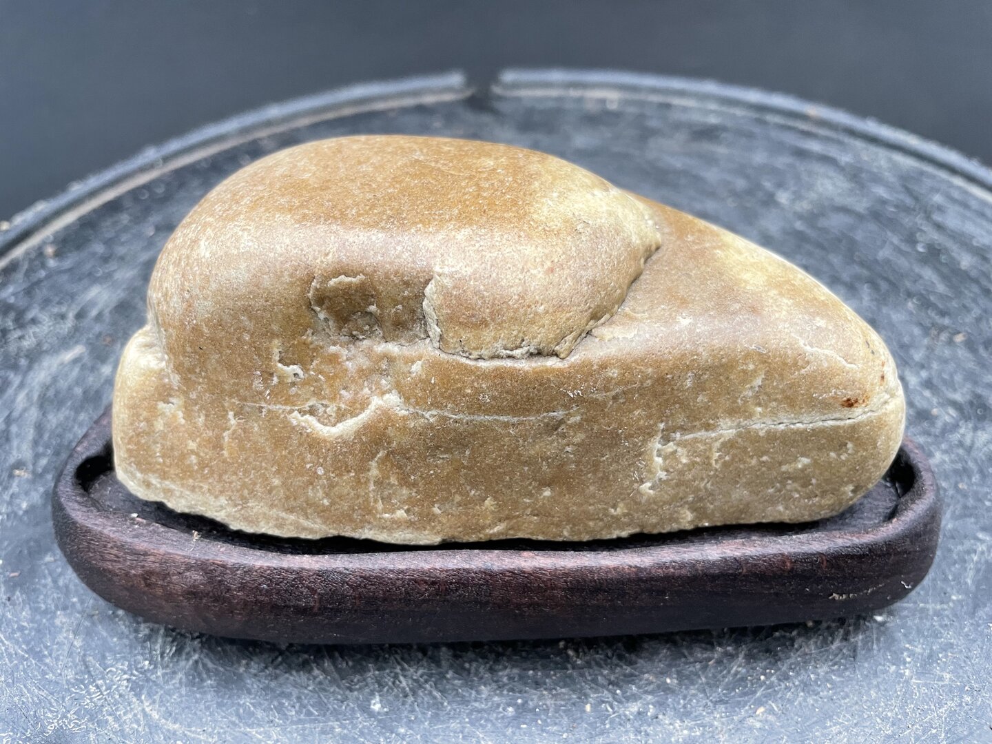 komplett naturbelassener, fein strukturierter Stein auf einem maßgefertigten "Dai" aus Holz; Höhe ca. 9,5x19 cm