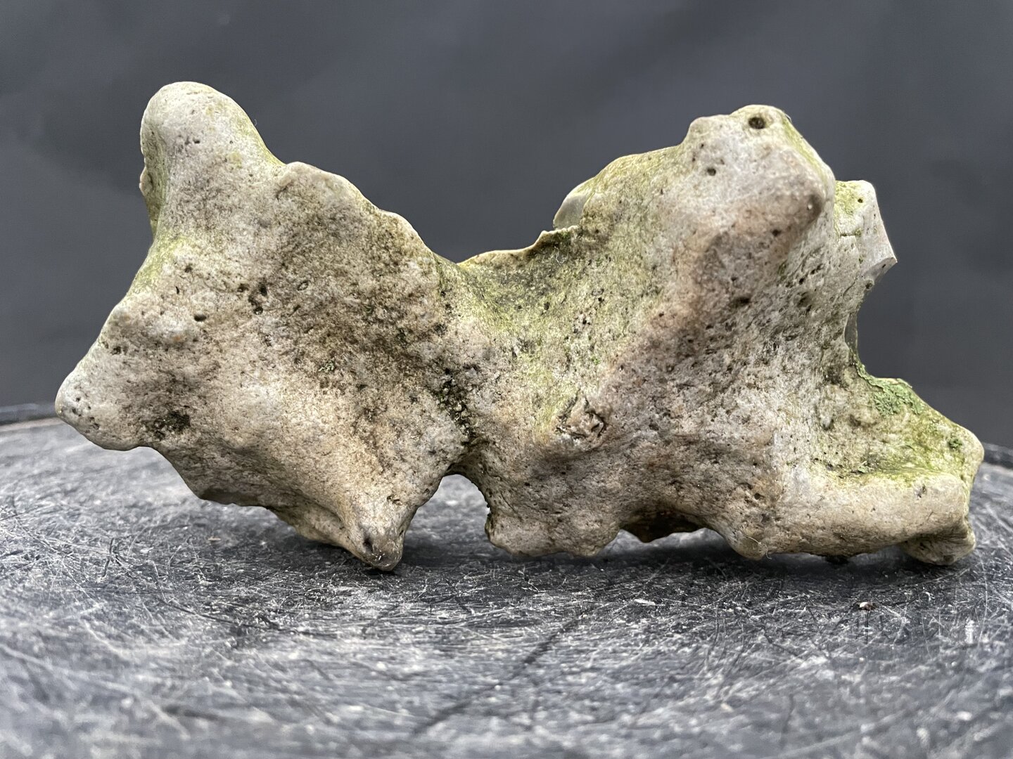 Weich geschwungener Stein mit zahlreichen Höhlungen und vielen möglichen "schönsten Seiten"; ohne abgebrochene Bereiche; im trockenen Zustand hellcremefarben, im feuchten gelblich-grau; ca. 19,5x10x10 cm